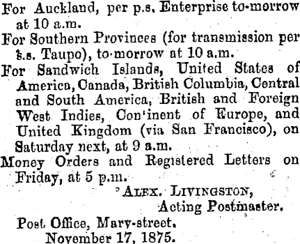 For Auckland, per p.s, Enterprise to-morrow afc 10 a.m. For Southern Provinces (for transmission per b.s. Taupo), to-morrow at 10 a.m. For Sandwich Islands, United States of America, Canada^ British Columbia, Central and South America, British and Foreign West Indies, Con'inent of Europe, and United Kingdom (via San Francisco), on Saturday next, at 9 a.m. Money Orders and Registered Letters on Friday, at 5 p.m. * 'Aeex. Livingston, Acting Postmaster. Pobl. Office, Marv-street, November 17, 1875.
