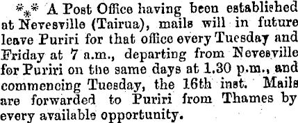 %* A Post Office having been established at Wevesville (Tairua), mails will in future leave Puriri for that office every Tuesday and Friday at 7 a.m., departing from Neveßville for Puriri on the same days at 1.30 p.m., and commencing Tuesday, the 16 th inst. Mails are forwarded to Puriri from Thames by every available opportunity.