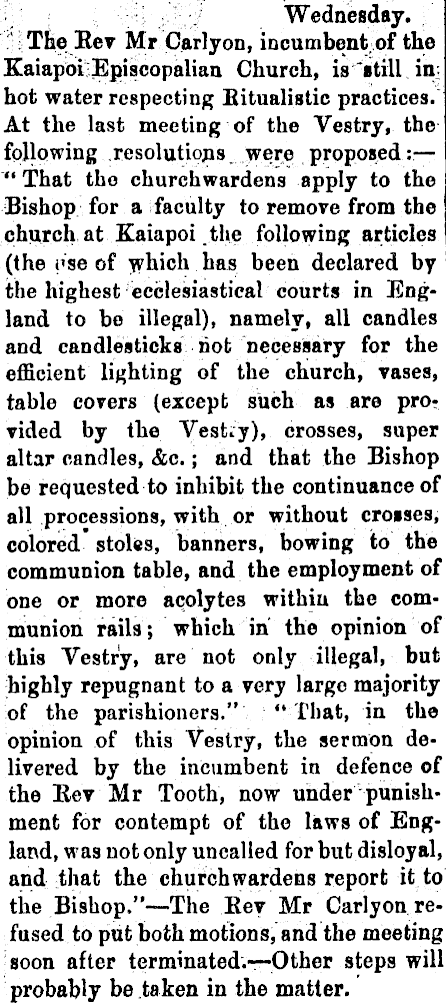 Wednesday. The Eev Mr Carlyon, incumbent of the Kaiapoi Episcopalian Church, is "still in hot water respecting Eitualistic practices. At the last meeting of the Vestry, the following resolutions, were proposed:— " That the churchwardens apply to the Bishop for a faculty to remove from the church at Kaiapoi the following articles (the nse of which has been declared by the highest ecclesiastical courts in England to be illegal), namely, all candles and candlesticks not necessary for the efficient lighting of the church, vases, table covers (except such as are pro? vided by the Vestiy), crosses, super altar candles, &c.; and that the Bishop be requested to inhibit the continuance of all processions, with or without crosses, colored stoles, banners, bowing to the communion table, and the employment of one or more acolytes within the communion rails; which in the opinion of; this Vestry, are not only illegal, but highly repugnant to a very large majority of the parishioners." "That, in the opinion of this Vestry, the sermon delivered by the incumbent in defence of the Eev Mr Tooth, now under punishment for contempt of the laws of England, was not only uncalled for but disloyal, and that the churchwardens report it to the Bishop."—The Eev Mr Carlyon refused to put both motions, and the meeting soon after terminated.—-Other steps will probably be taken in the matter.