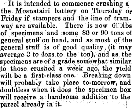 It is intended to commence crushing a the Moanatairi battery on Thursday 6r Friday if stampers and the line of tram, way are available.' There is now 6C3lbs of specimens and some 80 or 90 tons of general stuff on hand, and as most of the general stuff is of good quality, (it may average?) to 4ozs to the tori), arid as the specimens are of a grade somewhat similar to;those crushed a week ago, the yield will be a first-class one. Breaking down will; probably take place to-morrow, and doubtless when it does the specimen box will receive a handsome addition to the parcel already in it. !