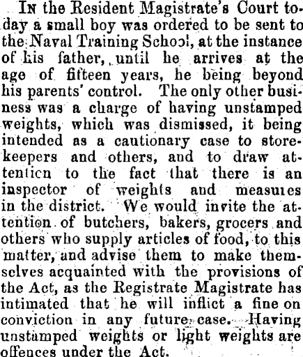 In the Resident Magistrate's Court today a small boy was ordered to be sent to the : Naral Training Schoal, at the instance of his father,, until he arrives at the age of fifteen years, he being beyond his parents' control. The only other business was a charge of haying unstamped weights, which was dismissed, it being intended as a cautionary case to storekeepers and others, and to draw atten lien'"to the fact that there is an inspector of weights and measmes in the district. We. would; in rite the attention of butchers, bakers, grocers and others who supply articles of food, tp this matter, and advise them to make themselves acquainted with the provisions of the Act, as the Eegistrate Magistrate has intimated that he will inflict a. fine on conviction in any future?; case, -leaving unstamped weights or light weights are ofFeaces under the Act. \ '