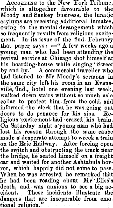 According to the New York Tribune, which is altogether favourable to the Moody and Sankey business, the luaatic asylums are receiving additional inmates, owing to the mental derangement which so frequently results from religious excitement. In its issue of the 2nd February that paper, says : —" A few weeks ago a young man who had been attending the revival service at Chicago shot himself at bis boarding-house while singing' Sweet by and by.' A commercial traveller who had listened to Mr Moody's sermons in the same city left his room in an Evansville, Ind., hotel one evening last week, walked down stairs without so much as a collar to protect him-from the cold, and informed the clerk that he was going out doors to do penance for his sins. Eeligious excitement had crazed his brain. On Saturday night a young man who had lost his reason. through the same cause made a desperate attempt to wreck a train on the Erie Railway. After forcing open the switch and obstructing the track near the bridge, he seated himself on a freight car and waited for another Ashtabula horror, which happily did not come to pass. When he was arrested he remarked that he had been reading about Mr Eliss's death, and was anxious to see a big accident. These incidents illustrate the dangers that are inseparable from emotional religion."