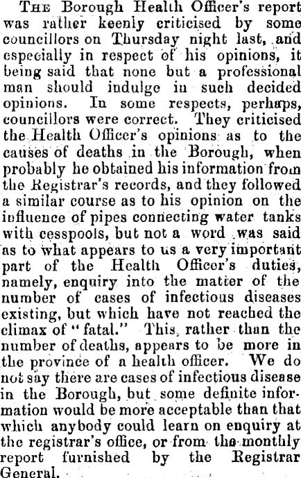 The Borough Health Officer's report was rather keenly criticised by some councillors on Thursday night last, .and especially in respect of his opinions, it being said that none but a professional man should indulge in such decided opinions. In some respects, perhaps, councillors were correct. They criticised the Health Officer's opinions as to the causes of deaths ,in the Borough, when probably he obtained his information from the .Registrar's records, and they followed a similar course as to his opinion on the influence of pipes connecting water tanks with cesspools, but not a word .was said as to what appears to us a very important part of the Health Officer's duties, namely, enquiry into the matter of the number of cases of infectious diseases existing, but which have not reached the climax of " fatal." This, rather than the number of deaths, appears to be more in the province of a health officer. We do not say there are cases of infectious disease in the Borough, but some definite information would be more acceptable than that which anybody could learn on enquiry at the registrar's office, or from* llMhmonthly report furnished by the Registrar General. \ »