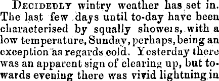 Decidedly wintry weather has set in. The last few days until to-day have been characterised by squally showeis, with a low temperature, Sunday, perhaps, being an exception as regards cold. Yesterday there was an apparent sign of clearing up, but towards evening there was vivid lightning, in