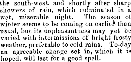 the south-west, and shortly after sharp showers of rain, which culminated in a wet, miserable night. The season of winter seems to be coming on earlier" than usual, but its unpleasantness may yet be varied with intermissions of bright frosty weather, preferable to cold rains. To-day an agreeable change set in, which it is hoped, will last for a good spell.