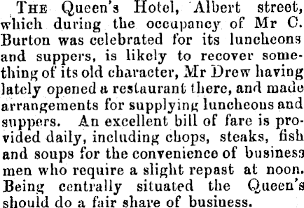 The Queen's Hotel, Albert street,: which during the occupancy, of Mr o.' Burton was celebrated for its luncheons and suppers, is likely to recover something of its old character, Mr Drew having lately opened a restaurant there, and made arrangements for supplying luncheons and suppers. An excellent bill of fare is provided daily, including chops, steaks, fish and soups for the convenience of business men who require a slight repast at noon. Being centrally situated the Queen's should do a fair shave of business.