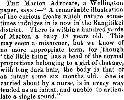 The Marton Advocate, a Wellington paper, says :—" A remarkable illustration of the curious freaks which nature sometimes indulges in is now in theßangitikei district. There is within a hundred yyrds of Marton a baby 18 years old. This may seem a misnomer, but we know of no more appropriate term, for .though ' the little thing' has a head of the normal proportions belonging to a girl of that age, with long dark hair, the body is that of an infant some six months old. She is carried about by a nurse, is in evei'y way tended as an infant, and unable to articulate a single sound."