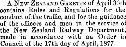 A New Zealand Gazette of April 3Ot,h contains Kales and Regulations for the conduct of:the traffic, and for the guidance of the officers and meu in the service of the New Zealand Railway Department, made in accordance with an Order in Council of the 17th day of April, 1877.