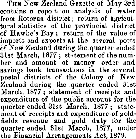The New Zealand Gazette of Majr 3rd contains a report on analysis of water from Rotorua district; return of agricultural statistics of the provincial district of Hawke's Bay ; return of the value of imports and exports at the several ports of New Zealand during the quarter ended 31st March, 1877 ; statement of the number and amount of money order and savings bank transactions in the several postal districts of the Colony of New Zealand during the quarter ended 31st March, 1877; statement of receipts and expenditure of the public account for the quarter ended 31st March, 1877 ; statement of receipts and expenditure of goldfields revenue and gold duty for the quarter ended 31st March, 1877, under the Financial Arrangements Act, 1879.
