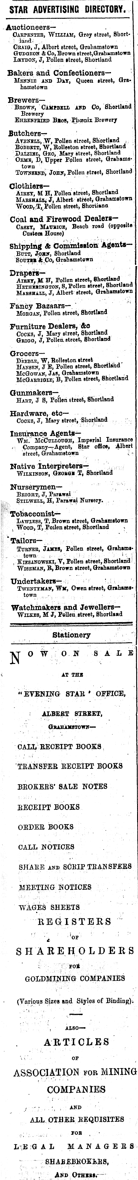 STAR ADVERTISING DIRECTORY. -Auctioneers— Oakpenteb, Wiixiam, Grey street, Short- - land OiiAiQ, J, Albert street, Graliamstown Gtjsqeoh & Co, Brown Btreet,Gralmmstown Lsyeok, J, Pollen street, Shortiand Bakers and Confectioners— ' Menijie ash Hki, Queen street, Gra- I hametown , Brewers— i Bmws, GlktwtUi aud Co, HHortland Brewery Eiibekpbied Bios, PJioonix Brewery Butcliers-r ' ATENBiiir, W, Pollen street, Shortiand ;: Bobbbtt, W, Rolleston street, Bhortland DAizhtc, Geo, Mary street, Shortiand ; Oemb, D, Upper Pollen street, Grahamstown ToTTOBBNif, John, Pollen atr«et, Sliortland Clothiers— . Aibbt, M H, Pollen Btreet, Shortiand MABSHAiL, J, Albert street Grahamßtoira Wooß x; T,Tollcn street, Shoriiana Coal and Firewood Dealers- ■ Cabet, Mattbiob, Beach road (opposite Cuitom House) Shipping A Coxnnlisfiioii Agents— BtriT, JohNj Shortiand "Sbtrnfi '#Jpo, Grahamstown Drapers— Anunr, M F, Pollen street, Shortiand Hethibinghon, S, Pollen street, Shortiand MABflHAii, J, Albert street, Grahanutown Fancy Bazaars—. ~ Mobgak, Pollen street;, Shortiand Furniture Dealer^ &o Cocks, J, Mary street, Shortiand Geigo, J, Pollen, street, Shortiand Grocers— Dbebie, Wi Rolleston ttrcet . , _ Hansen, J B, Pollen street, Bhortland McGowan, Jab, Grahamßtown . McGabrioie; B, Pollen street, Shortiand Qunmakers— Hart, J S, Pollen street, Shortiand Hardware, etc— Cooks, J, Mary street, Shortiand..,., :;. ; Insurance Agents— War. McCxrJJWVQji, Imperial Insurance , Company-trAgent, Star office, Albert street, Grahamstown . - Native Interpreters— Wilkihsoh, G2OB<M T, Shortiand Nurserymen— Beight, J, Parawai Sxilweil, H, Parawai Nursery. Tobacconist— Lawitos, T, Brown street, Grahamstown . Wood, T, Pollen street, Shortiand . * Tailors— Tubkeb, Jaxxs, Pollen street, Grahamitown . ' . KiEaAirowsKl, V, Pollen street, Shortiand Wiseman, R, Brown street, Grahamßtown Undertakers— TwEffTTMAN, Wic, Owen Btreofc, Grahamstown Watchmakers and Jewellers— Wixxes, M J, Pollen street, Shortlasd Stationery VT 0W ' O. B" SALE ■ AT THE . «EVENING STAB ' OFFICE, : ALBERT STREET, GXAHAXBTOmr— CALL EECEIPT BOOKS t TEANSFEE EECEIPT BOOKS BEOKEBS' SALE NOTES EECEIPT BOOKS OEDEE BOOKS CALL NOTICES SHAKE and SCEIPTKANSFEES MEETIKGr NOTICES WAGES SHEETS REGISTERS SHAREHOLDERS GOLDMINING COMPANIES (Various Sizes and Styles of Binding); , AISO— ARTICLES OF ASSOCI^TIQN for MINING COMPANIES /:;-;....:, ;: : AHD : ; ALL OTHEE EEQCISITEB L\'B GAL MANAGE E S SHA££BEOKIi.ES f And Othibiy