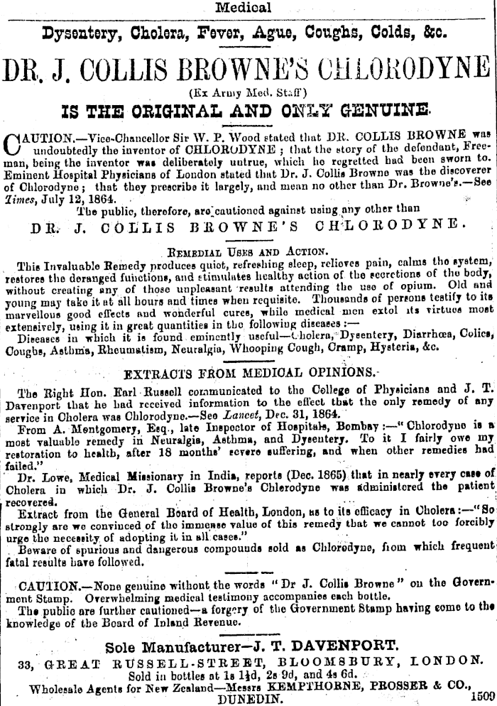 Medical Dysentery, Cholera, Fever, Ague, Coughs, Colds, Sec. DB, J. COLLIS BROWNE'S OHLOKODYHE (Ex Army Mod. Stiff) ZS THE ORiaiNALJUH) ONLY GENUINE. /""UUTION.—Vice-Chancellor Sir W. P. Wood stated that DX. COLLIS BROWNE was KJ undoubtedly the inTentor of OHLORODYJSE 5 (hat the etory of tho defendant, *reeinan, being the inventor was deliberately uutrue, which ho regretted had been sworn to. Eminent Hospital Physicians of London stated Unit Dr. J. Collis Browne was the discoverer of Ohlorodyne; that they prescribe it largely, and mean no other than Dr. Browne ».—Hee limes, July 12,1864. >» The public, therefore, arc" cautioned against using any other than DB. J, COLLIS BEOWNE'S C H'L OEOD YN E . Bemediai Usjbb and Action. This Invaluable Remedy produces quiot, refreshing sleep, relieves pain, calms tho system, restores tho deranged functions, and stimulates healthy action of the secretions of tho bofly, without creating any of those unpleasant results attending tho uao of opium. Uld nna young may take it nt all houru and times when requisite. Thousands of pereons testify to «b marvellous good effects Rnd wonderful cures, while medical men extol iti Tirtuea most extensively, using it in great quantitiei in tbo following diseases: — Diseases in which it is found eminently useful—(.holera, Dysentery, Diarrhoea, Oolics, Coughs, Asthma, Rheumatism, Neuralgia, Whooping Cough, Cramp, Hysteria, &c. BXTRAOIB FJROM MEDICAL OPINIONS.Tho Eight Hon. Earl Russell communicated to the College of Physicians and J. T. Davenport that he had received information to the effect tb»t the only remedy of any service in Cholera was Ohlorodyne.—Seo Lancet, Dec. 31,1864. . Prom A. Montgomery, Esq., late Inspector of Hospitals, Bombay :—" Cblorodyno m a moat valuable remedy in Neuralgia, Asthma, and Dysentery. To it I fairly owe my restoration to health, after 18 months' eevtre BufFering, and when other remedies had failed." " Dr. Lowe, Medical Missionary in India, reports (Dec. 1865) that in nearly erery out of Cholera in which Dr. J. CoIHb Browne's Chlerodyne was administered the patient Extract from the General Board of Health, London, as to its efficacy in Cholera:—"So strongly are we convinced of tho immense value of this remedy that we cannot 100 forcibly urge the necessity of adopting it in all: cases." : , j. » Beware of spurious and dangerous compounds sold as Chloredyne, fiom which frequent' fatal results have followed. ', CAUTION.—None genuine without the words "Dr J. CoIHb Browne" ou the Government Stamp. Overwhelming medical testimony accompanies each bottle. Tb« public ore further cautioned—a forgery of the Government Stamp having come to tht knowledge of the Board of Inland Revenue. Sole Manufaeturer-J. T. DAVENPORT. 33, GREAT RtfSSELL-STREET, BLOOMBBURY, LONDON. Sold in bottles ofc la l|d, 2s 9d, and 4s 6d. Wholesale Agents for Kew Zealand—Messrs KEMPXHOBKE, PBOSSER & CO., B DUNEDIN. 1509