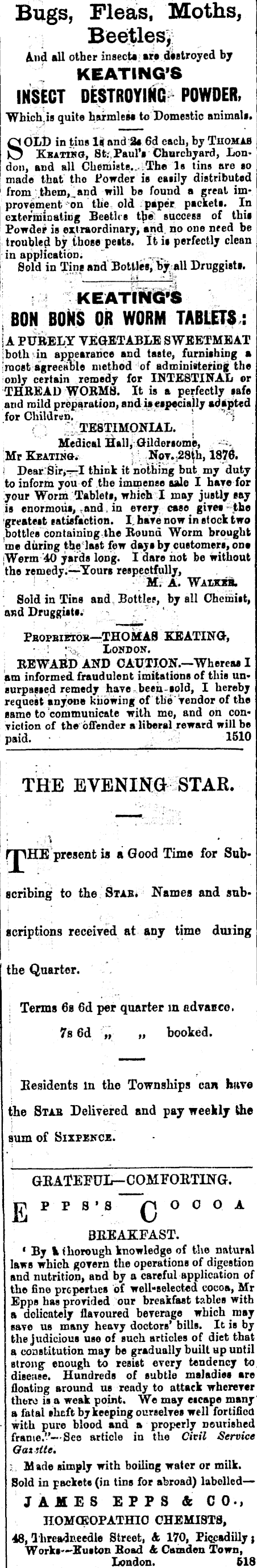 Bugs, Fleas, Moths, Beetles/ And all other insect* in destroyed by . HEATING'S INSECT DESTROYING POWDER, "Which.is quite harmless to Domestic animali. SOLI) in tins Is and _* 6d each, by Thomas Kbatukj, Bfe,Paul's Churchyard, London, and all Chemists... The Is tins are so made that tho Fowder is eaiily distributed from ,them,^and will be found a great improvement "on the old paper packets. In exterminating Beetles the success of this Powder is extraordinary, and no one need be troubled by those pests. It is perfectly clean in application. * ... Sold in Tine and Bottles, by all Druggists. H HEATING'S BON BONS OR WORM TABLETS: {A PURELY VEGETABLE SWEETMEAT both in appearance and taste, furnishing a iraost agreeable method of administering the ■only certain remedy for INTESTINAL or THREAD WORMS. It is a perfectly safe and mild preparation, and m especially adapted for Children. ' ""'i f ;■■■; ::; TESTIMONIAL. ' j Medical Hall, Qildersome, --•. iMrKEATnifti Nor. ,28|h, 1870. ! Dear':Bir^l think it nothing bat my duty to inform you of the immense sale I hare for your Worm Tablets, which I may justly say is enormous, and in erery case gires the greatest tatisfa'ction. I. hare now in stock two bottles containing the Bound Worm brought me during the laet few days by customers, one [Worm "40 yards long. I dare hot be without the remedy;— Yours respectfully, M, M. A. WAurJi. Sold in Tins and Bottler, by all Chemist, and Druggists. ' Pbofbietok—THOMAS KEATING, •- •: '%: London. ; REWAfID AND CAPTION.— Whereas I am informed, fraudulent imitations of this unsurpassed remedy have been-sold, I hereby request anyone knowing of the Vendor of the same to communicate with mo, and on con* ■viclion of the offender a liberal reward will be paid. __ _1510 THE EVENING STAR. npHE present is a Good Time for Sab* scribing to the Stab. Names and sub* gcriptions received at any time during the Quarter. \ Terms 6s 6d per quarter in advance. i 7s 6d „ booked. Residents in the Townships can hnve the Stab Delivered and pay weekly the sum of Sixpence. GRATEFUL— COMFORTING. ™P P S'S pOO O A BREAKFAST. • By » thorough knowledge of the natural laws which govern the operations of digestion and nutrition, and by a careful application of the fine properties of well-selected cocoa, Mr Epps has prodded our breakfast tables with a delicately flavoured beverage which may save us many heavy doctors' bills. It is by the judicious use of such articles of diet that a constitution may be gradually built up until strong- enough to resist every tendency to, disease. Hundreds of subtle maladies are floating around us ready to attack wherever there is a weak point. We may escape many' a fatal shaft by keeping ourselves well fortified with pure blood and a properly nourished frame?'—Seo article in the Civil Service Gat Me. l. Made simply with boiling water or milk. Sold in packets (in tins for abroad) labelled— JAMES EPPS & CO., HOMffiOPATHIO CHEMISTS, 48, Threadneedle Street, & 170, Piccadilly} Works—Euston Boad & Camden Town, London. 618