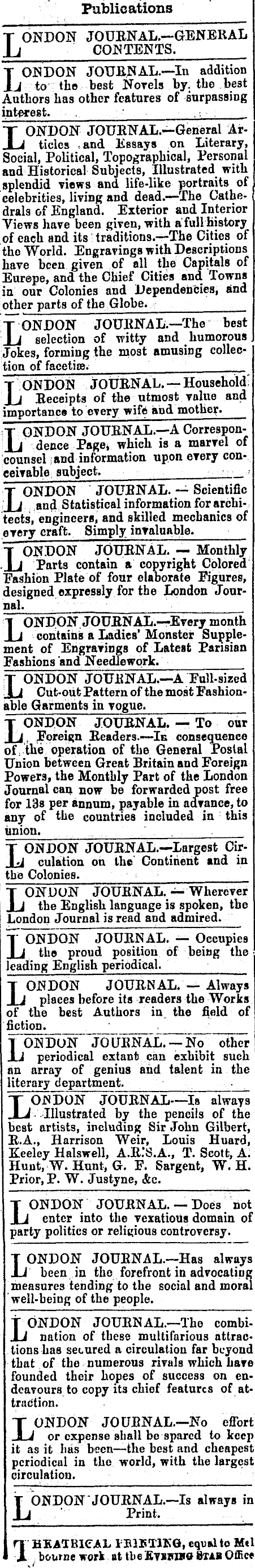 Publications T ONDON JOURNAL.—GENERAL Jj CONTENTS. lON DON JOURNAL.—In addition J to the best Novels by, the be3t Authors has other features of surpassing interest. . • : LONDON JOURNAL.—General Articles .and Essays on Literary, Social, Political, Topographical, Personal and Historical Subjects, Illustrated with splendid views and life-like portraits of celebrities, living and dead. —The Cathedrals of England. Exterior and Interior Views have been given, with afull history :of each and its traditions.—The Cities of the World. Engravings with Descriptions have been given of all the Capitals of Eurepe, and the Chief Cities and Towns in our Colonies and Dependencies, and other parts of the .Globe* T- ONDON JOURNAL.—The best JJ selection of witty and humorous Jokes, forming the most amusing collection of facetiae. T ONDON JOURNAL. — Household" J j Receipts of the utmost value and importance; to every wife and mother. T ONDON JOURNAL;—A CorresponJJ dence Page, which is a marvel of counsel i and information upon every conceivable; subject. _f T ONDON JOURNAL. — Scientific iJj and Statistical information for architects, engineers, and skilled mechanics of every craft. Simply invaluable. T ONDON JOURNAL. — Monthly .Jj Parts contain a copyright Colored Fashion Plate of four elaborate Figures, designed expressly for the London Journal. T ONDON. JOURNAL.—Every month I j contains a Ladies' Monster Supplement of Engravings of Latest Parisian Fashions and Needlework. iff ONDON JOURNAL.—A Full-sized Jj Cut-out Pattern of the most Fashionable Garments in vogue. T ONDON JOURNAL. —To our Jj. Foreign Readers.—le consequence of the operation of the General Postal Union between Great Britain and Foreign Powers, the Monthly Part of the London Journal can now be forwarded post free for 13s per annum, payable in advance, to any of the countries included in this union. T ONDON JOURNAL.—Largest CirJLj culation oh the Continent and in the Colonies. T ONDON JOURNAL.---Wherever JJ the English language is spoken, the London Journal is read and admired. T ONDON JOURNAL. — Occupies JJ the proud position of being the leading English periodical. ■ TON DON JOURN AL. — Always JJ places before its readers the Works of the best Authors in the field of fiction. ■ . ■• L"dl«Di^l^UßNAL7^No" other periodical extant can exhibit such an array of genius and talent in the literary department. T Otf DON JOURNAL—Is always JIJ Illustrated by the pencils of the best artists, including Sir John Gilbert, R.A., Harrison Weir, Louis Huard, Keeley Halswell, A.R.'S.A., T. Scott, A: Hunt, W. Hunt, G. F. Sargent, W. H. Prior, P. W. Justyne, &c. T ONDON JOURNAL. — Does not Jj enter into the vexatious domain of party politics or religious controversy. T ONDON JOURNAL.—Has always JJ been in the forefront in advocatipg measures tending to the social and moral well-being of the people. t ONDON JOURNAL.—The combiJJ nation of these multifarious attractions has secured a circulation far beyond that of the numerous rivals which hare founded their hopes of success on endeavours to copy its chief features of attradtinn. X ONDON JOURNAL.—No effort I J or expense shall be spared to keep it as it has been—the best and cheapest periodical in the world, with the largest circulation. f ONDON "JOURNAL.—Is always in Jj ' Print. - . ri™ HKATBICAL fBHSTIKG, equal to Mtl X _ bourse work at tbeEviziivo Stab Office