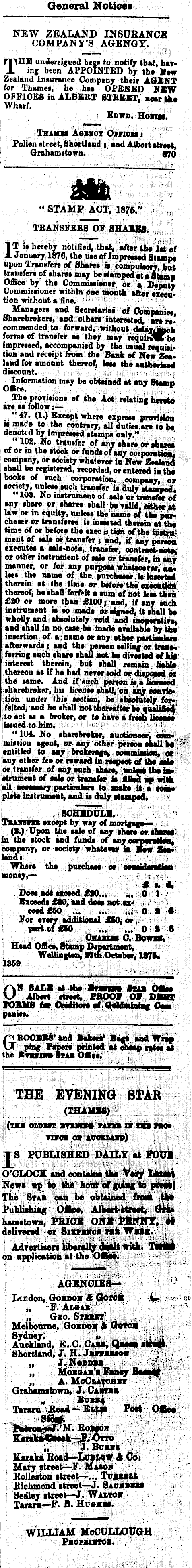 General Notioes NEW ZEALAND INSUBAWCE COMPANY'S AGBNGY. mHE unsleraigced begs to notify that, hayX in{ been APPOINTED by the Heir Zealand Insurance Company their AGBNT for Thames, he has OPENED MIW Of FICES in ALBERT STREET, Bear Ike Wharf. Edwd. Hoxim. Thamu Acmroz Onion: Pollen street, Skortland ; and Albeit ttrcet, Orahamstown. \ 970 m C " STAMP ACT, 1875." , . TRANSFEBB OF SHAKES. , IT is hereby notified,.that, after the lsi of January 1876, the use of Impressed Stamps upon Transfers of Shares it compulsory, tat transfers of shares may be stamped at • Stamp Office by the Commissiener or » Deputy Commissioner within one month alter ezeeu* tfon without a fine. ;' Managers and Secretaries of Oompanies Sharebrekers, and others interested, are recommended to forward, without delaTismeh forms of transfer as they may requirjlsVbe impressed, accompanied by the usual requisi> tion and receipt from the Bank of New Zea* land for amount thereof, less the aatlteriseel discount. '-..• ■ . „ <. Information may be obtained at any Btamn Office. , The provisions ef the Act relating hereto are ai follow:— • " 4!* (1>) 5* c*pt whew "P"" pn>vi«km v made to the contrary, all duties an to be denoted by impressed stamps only." " 102. No transfer of any share or shares of or in the stock or funds of any corporstiosi. company, or society whatever ia New Zealand shall be reguUred, recorded, or entered in the books of such corporation, company, or society, unless such transfer is duly stamped^ " 103. No instrument of. sale or trsmsferof any share or shares shall be TfJid, either at law or in equity, unless the name of ta* purchaser or transferee is insetted therein at the tims of or before the exec a.tion of the itiitrs* ment of sab or transfer % and, if any person executes a sale«noU, transfer, contract-note, or other initranient of sale or transfer, in any manner, or for any purpose whatsoever, suv* lets the name of the. purchaser Is inserted therein at the time or before the exeeuttoB r thereof, he shall forfeit a sum of not lets than £20 or more than jBIOO j and, if any such instrument is so made or signed, it shall be wholly »nd absolutely void and inoperative, and shall in no case-be made available by tiw insertion of a name or any other partievlan afterwards j and the person telling or traot* - ferring such share shall not be dirested of hit interest* therein, but shall remain. h'ltHt .thereon as if he had nerer sold or dispoMd of the same. And if mich person is, a licekesd ith'arebroker, his license shall, on anj oonrio*' tion under this section; be absolutely for-: ifeitedi and he shall not thereafter be qualified' to act as a broker, or, to hare a fresh lioente issued .to-him, J»< ; ; =1 " 104. No sharebreker, auctioneer, com. mission agents or any other person shall b« '-'■■'* entitled to any brokerage, eommisaioa, or any ether fee or reward in nspeot of the aato or transfer of any such share, inisjj the) is> strumeat of cab or transfer is illsdmp with all necessary particulars to make it a toiw plete icstrument, and it duly; stamped* ; , SOHXPVLB. . : ' TBAJTBRB except by way of mortgage-- , < . (S.) Upon the tale of any than or.thaasj. in the stock and funds of any eofporatieo, company, or society whatetw ia Vew:St»>: huiO t ■.'-:.''..: When the purchase or orandevatim money,— • - :■; .•■„•■ : - ' * •. d. Does ndt noted £*)... ... 0 1 Exceeds £80, and dote not ex* ■;. ? : ceed£6O ; ... 0 1 « For every additional «0, or : part of £60 ... ... 0 16 ... OuAMim 0. Bownr. Head Offlce, Stamp Department, WelUngtia, BTthOctobtr, It7f. 1859 OH SAL! ai the Wrwnw lvi Osk» Albert street, PBOOV OF DBBT FORMS for Orediton sf HiHmtntat Oasa paniea. p BOOBM' and Bakers' Bags aad Wrap VJ ping Ptpeni printed at obeap rates at the Irarar* Scis Oflee. ; • THE EVENING STAB (THAMES) ; (VMM OLDWn XYXMM MMB KM tMM 1104 TUTOB Off "AVOSttro) X 8 PUBLISHED DAILY at FOtJl O'OLOCX: and eontaina »h» Ta#f t*te3.t News «p to the houirof gUmf to prvftj The. Stab can be obtained hem th« Pubiiahittff Oske, Alkart-ttrw**, o*4. hamstown, PfilOK OWE PBNKT, w# deliTerad or Bixniroa *■! Wbbk.^ AdTertiseMUb«aliyde*ltwith. Tiriifl:on applieatida at the Ofte* ' ;"' ;:, I ■ ' , .. ... ,_ ' . AGENGDC's-i-. ■ ;■"' ° "' Lcndon, Goxnoir & Goto* -Lr .■* •■' ™ I „ ■-P.Aw*b';!." ' ■■/- ! „ GSO. STWUtT 1 . , • I Melbourne, GoaDO»t * Golem ; • Sydney; ' '«»«.- -" ■!*-ii"--Auckland, £. C. CaSB, Q«M» •*•#! Shortland, J. H. JMWfMMtoM ;•' . , J.Nwdii . ; ..-•:,- W.*;:- •:■: Moioij'i Fancy Baaa# „ A. MoClaxchst ;?' ■' Grahamitown, J. Oa*tjh - „ . Svbb^- '"' " '■: . . Taraxu ORoad—Elmi Potl Oflcs) P»s*«ew3r/M.EoIfOK ■ . ' '.■"'■ •■•"' ■ Karaki«Baak—7-Otto , \ : ;, J. Bumm v ._ JLaraka Koad—Lcblow 4 0o» : Mary street—F. Masoh Solleiton street—... Tobkiu Kichmond ttreet—J. Savwsm Sealer itreet—J. W-sxtok Tarara—F. B. Hcohm. WILLIAM MoCULLOUGH Puontinoi. . _ ;