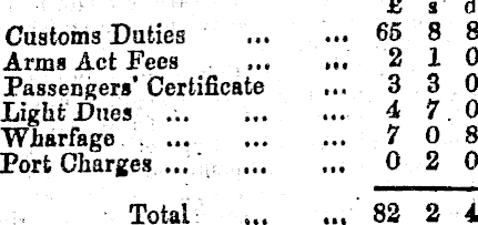 Customs Duties Arms Act Fees ... Passengers' Certificate Light Dues Wharfage Port Charges ..." ... ... 65 8 ... 2 1 ... 3 3 ... 4 1 ... 1 0 ... 0 2 Total ... ... 82 2