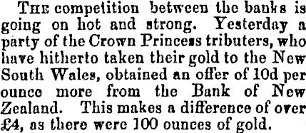 The competition between the banks is going on hot and strong. Yesterday a party of the Crown Princess tributers, who have hitherto taken their gold to the New South Wales, obtained an offer of lOd per ounce more from the Bank of New Zealand. This makes a difference of over £4, as there were 300 ounces of gold.