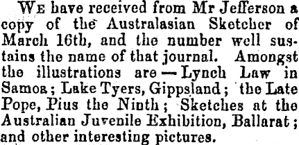 We have received from Mr Jefferson a copy of the~ Australasian Sketcher of March 16th, and the number well sustains the name of that journal. Amongst the illustrations are — Lynch Law in Samoa; Lake Tyers, Gippsland; the Late Pope, Pius the Ninth; Sketches at the Australian Juvenile Exhibition, JBallarat; and other interesting pictures.