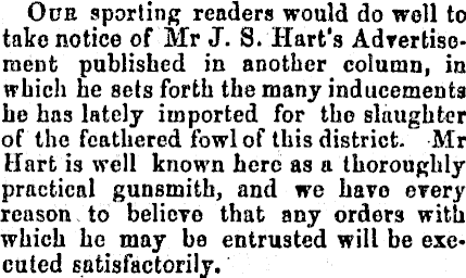 Our sporting readers would do well to take notice of Mr J. S. Hart's Advertisement published in another column, in which he sets forth the many inducements he has lately imported for the slaughter of the feathered fowl of this district. Mr Hart is well known here as a thoroughly practical gunsmith, and we have every reason. to believe that any orders with which he may be entrusted will be executed satisfactorily.