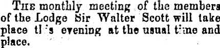 The monthly meeting of the members of the Lodge Sir Walter Scott will take place tl *serening at the usual tUne and place. '