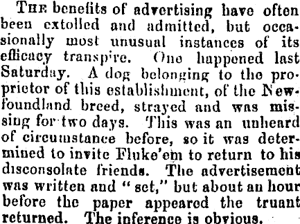 The benefits of advertising have often been extolled and admitted, but occasionally most unusual instances of its efficacy transpire. 'One happoned last Saturday. A dog belonging to the proprietor of tins establishment, of the Newfoundland breed, strayed and was missing for two days. This was an unheard of circumstance before, so it was determined to invite Fluke'ebi to return to his disconsolate friends. The advertisement was written and " set," but about an hour before the paper appeared the truant returned. The inference is obvious.