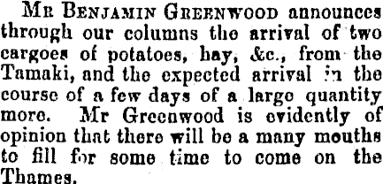 Me Benjamin Gbekntvood announces through our columns the arrival of two cargoes of potatoes, hay, &c, from the Tamaki, and the expected arrival ?i the course of a few days of a largo quantity more. Mr Greenwood is evidently of opinion that there will be a many mouths to fill for some time to come on the Thames.