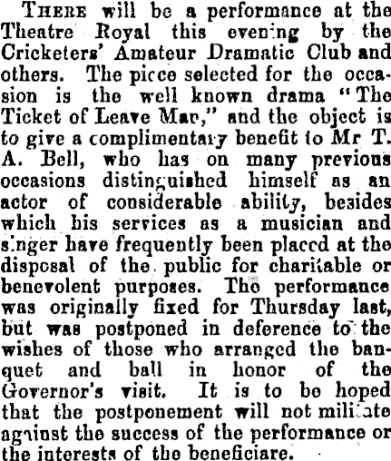 There will be a performance at the Theatre Royal this evening by the Cricketers' Amateur Dramatic Club and others. The piece selected for the occasion is the well known drama "The Ticket of Leave Map," and the object is to give a complimentary benefit to Mr T. A. Sell, who has on many previous occasions distinguished himself as an actor of considerable ability, besides which his services as a musician and s'nger have frequently been placed at the disposal of the. public for charitable or benevolent purposes. The performance was originally fixed for Thursday last, but was postponed in deference to" the wishes of those who arranged the banquet and ball in honor of the Governor's viait. It is to be hoped that the postponement will not miliate agninst the success of the performance or the interests of the beneficiare.
