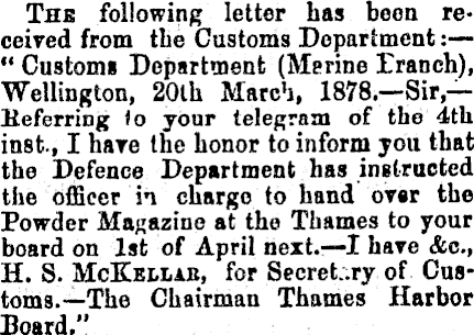The following letter has been received from the Customs Department:— " Customs Department (Merine Tranch), Wellington, 20lh March, 1878.—Sir,— Referring fo your telegram of the 4th inst., I have the honor to inform you that the Defence Department has instructed the officer in charge to hand ovar the Powder Magazine at the Thames to your board on Ist of April next.—l have &c, H. S. McKeHiAB, for Secretary of Customs.—The Chairman Thames Harbor Board."