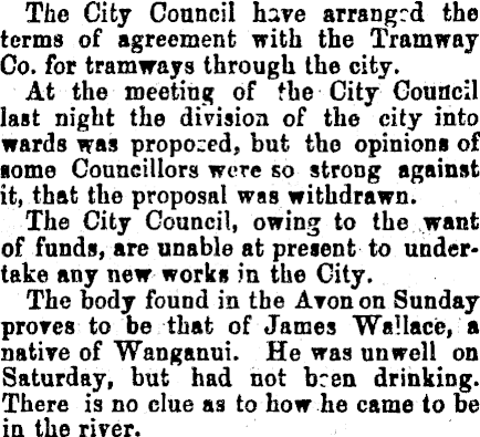 The City Council have arranged the terms of agreement with the Tramway Co. for tramways through the city. At the meeting of the City Council last night the division of the city into wards was proposed, but the opinions of some Councillors were so strong against it, that the proposal was withdrawn. The City Council, owing to the want of funds, are unable at present to undertake any new works in the City. The body found in the Avon on Sunday proves to be that of James Wallace, a native of Wanganui. He was unwell on Saturday, but had hot been drinking. There is no clue as to how he came to be in the river. .
