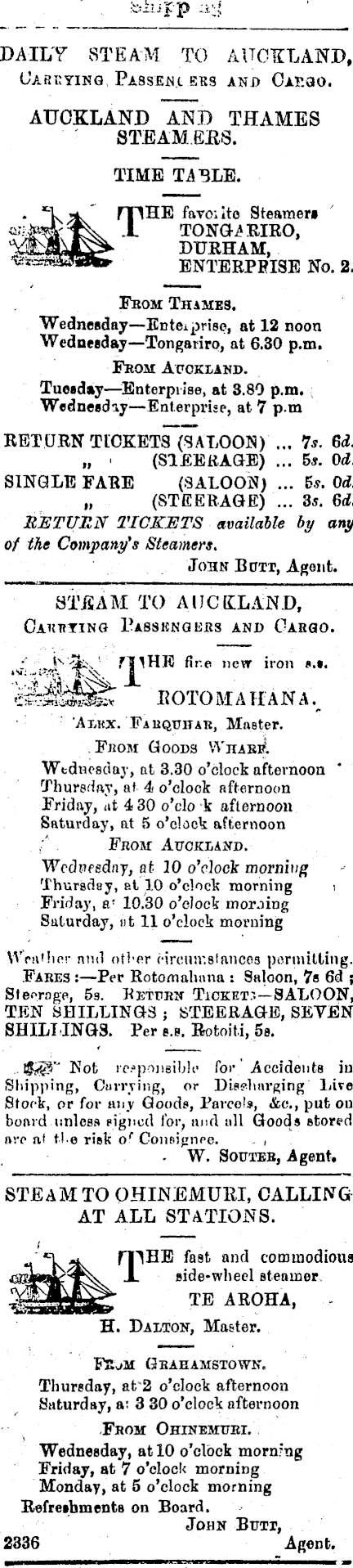 DAILY STEAM TO AUCKLAND, UaBIIYINQ, PABSB^.C EUS AN.D OaF-GO. AUCKLAND AND THAMES STEAM .EBB. TIME TABLE. . rfIHE favoiite Steamero -*- TONCMRIRO, DUKHAM, *z^®&&* ENTERPEISE No. 2. From Thames. Wednesday— Entexprise, at 12 noon Wednesday—Tongatirq, at 6.30 p.m. From Auckland. Tuesday—Enterprise, at 3.80 p.m. ; Wednesday—Enterprise, at 7 pm RETURN TICKETS (SALOON) ... 7*. 6d. „ ■ (SIEERAGE) ... s*. Od. SINGLE FARE (SALOON) ... s*. Od. „ (STEERAGE) ... 3s. 6rf. &ETUEN TICKETS available by any of the Company's Steamers. John Bott, Agent. STJSAM TO AUCKLAND, CaUTJYING P.ASSKNQEfiS AND CaHQO. ;' _J N-a^s' HMHE fire new iron «■•. WM<£^ BOTOMAHANA. : \At,hx. Fauquhab, Ma.Bter. Fjiom Goods W'jub^. Wednesday, at 3.30 o'clock afternoon * Thursday, at 4 o'clock afternoon Friday, <it 4 30 o'clo k afternoon Saturday, at 5 o'clock afternoon / From Attckiamd. Wednesday, at 20 o'clock morn'wg Thursday, at 10 o'clock morning > Friday, a' 10.30 o'clock morjing Saturday, lit 11 o'clock morning WriiUipr mid otl'er (•ircmr.siancoa permitting. Fares :—Per Rotomahtma : Saloon, 7s 6d ; Steerage, ss. Hetprn Ticket:.—SALOON, TEN SHILLINGS ; STEERAGE, SEVEN SHILLINGS. Per b.b. Rotoiti, ss. ... IS*P" Not ic^pojisiblc for' Accidents in Shipping, Currying, or Disehnrging Live Stofk, or for any Goods, Parcels, &c, put on board unless eignod for, and till Goods stored nrp at t!-e risk o f Consignee. . , - W. Soxtter, Agent. STEAM TO OHINEMUEI, CALLING AT ALL STATIONS. " «=i *l riIEE fast and commodious JSIfSStT^s. JL side-wheel steamer, jlgEjgjg- TE AROHA, .- H. Dalton, Master. FSjM Gbahamstown. Thursday, at"2 o'clock afternoon Saturday, a: 3 30 o'clock afternoon From Obhtemtjei. Wednesday, at 10 o'clock mornjng Friday, at 7 o'clock morning Monday, at 5 o'clock morning Refreshments on Board. John Bttti, 2336 Agent.