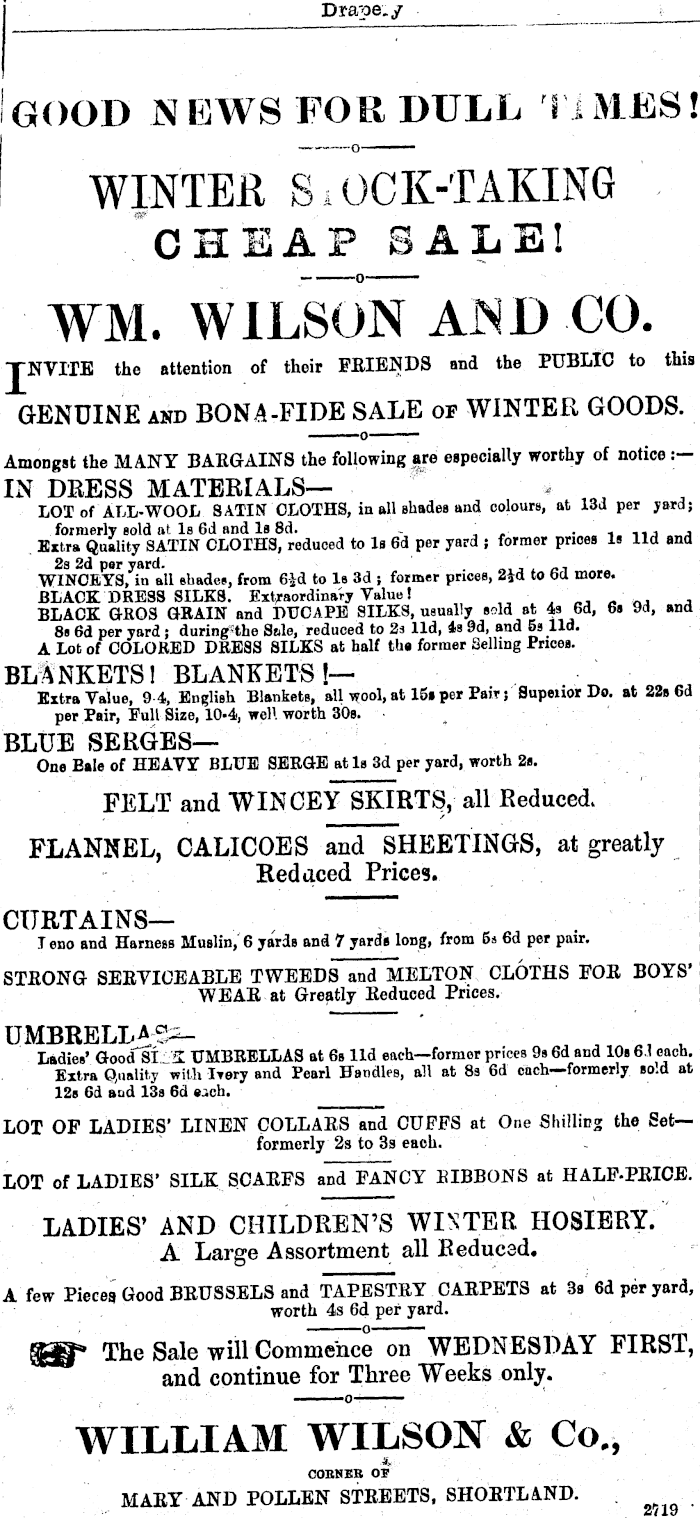 Drape./ ___ - 'GOOD NEWS FOR DULL TIMES! WINTER S A OCE-TAKING ■■10' ■■ ■ CHEAP SALE! WM. WILSON AND CO. TNVITE the attention of their FBIENDS and the PUBLIC! to this GENUINE and BON A-FIDE SALE of WINTER GOODS. Amongst the MANY BARGAINS the following are especially worthy of notice :— IN DRESS MATERIALS— ** LOT of ALL-WOOL SATIN CLOTHS, in all shades and colours, at 13d per yard; formerly Bold at Is 6d and Is Bd. - , . . ' .-, , Extra Quality SATIN CLOTHS, reduced to Is 6d per yard ; former prices Is lid and WINCEYs/in all ahadee, from 6£d to Is 3d } former prices, 2*d to 6d more. BLACK DRESS SILKS. Extraordinary Value! ' . <, 3 <. ft 4 j BLACK GROS GRAIN and PUCAPE SILKS, usually sold at 4s 6d, 6s 9d, and 8s 6d per yard; during^the Sale, reduced to 2s lid, 4s 9d, and 5s lid. A Lot of COLORED DREBS SILKS at half th« former Selling Pnceß. BLANKETS! BLANKETS !— Extra Value, 94, English Blankets, all w.ool, at 15i per Pair} Supenor Do. at 22s 6d per Pair, Full Size, 10-4, well worth 30s. BLUE SERGES— One Bale of HEAVY BLUE SEBGE at Is 3d per yard, worth 2s. FELT and WINCEY SKIRTS!, all Reduced. FLANNEL, CALICOES and SHEETINGS, at greatly Red deed Prices. CURTAINS— . T eno and Harness Muslin, 6 yards and 7 yards long, from 5* 6d per pair. STEONG SERVICEABLE TWEEDS and MELTON CLOTHS FOE BOYS' WEAE at Greatly Eeduced Prices. | UMBBELL£S%- , ■ | Ladies' Good SI^S UMBRELLAS at 6s lid each—former prices 9s 6d and 10s 6.1 each. , Extra Quality with Ivery and Pearl Handles, all at 8s 6d each—formerly sold at 12s 6d aud 13s 6d e^ch. LOT OF LADIES' LINEN COLLAES and CUFFS at One Shilling the Setformerly 2s to 3a each. LOT of LADIES' SILK SCAEFS and FANCY BIBBONS at HALF-PEICE. LADIES* AND CHILDREN'S WINTER HOSIERY. A Large Assortment all Reduced. A few Pieces Good BEUSSELS and TAPESTEY CAEPETS at 3n 6d per yard, worth 4s 6d per yard. §aS* The Sale will Commence on WEDNESDAY FIRST, and continue for Three Weeks onty. WILLIAM WILSON & Co.^ COBNBB OS MAEY AND POLLEN STEEETS, SHOBTLAND. --■•■■ 2/19