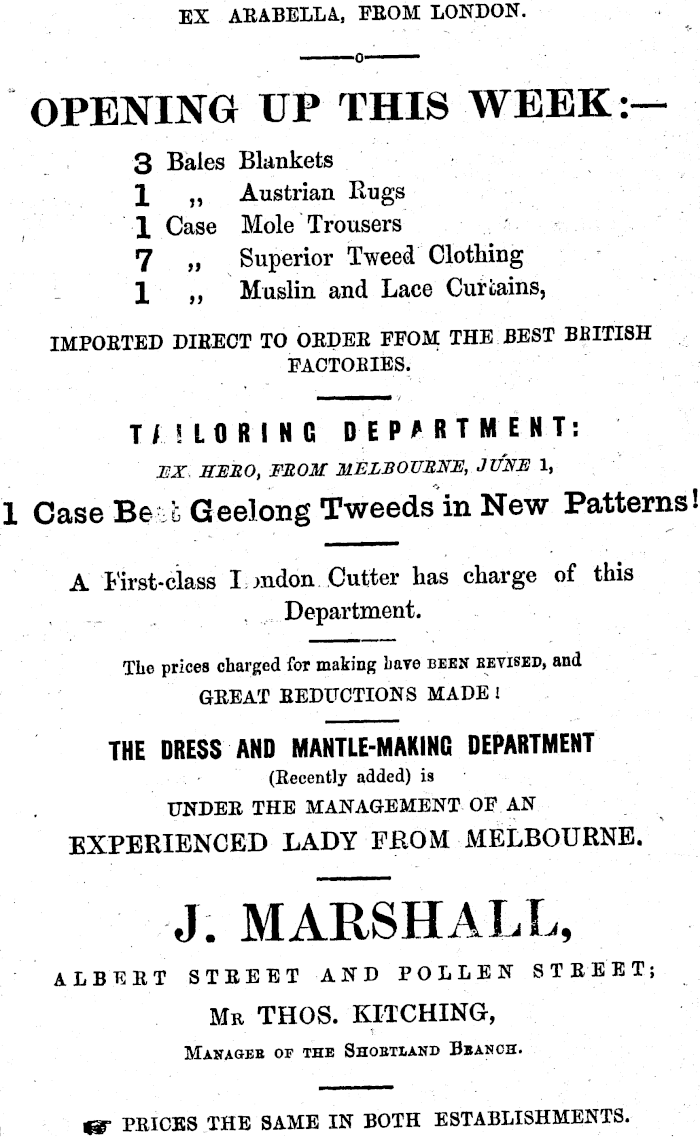 EX ARABELLA., FROM LONDON. OPENING UP THIS WEEK:— 3 Bales Blankets 1 „ Austrian Rugs 1 Case Mole Trousers ' 7 „ Superior Tweed Clothing 1 „ Muslin and Lace Curtains, IMPOETED DIRECT TO ORDER FFOM THE BEST BBITISH FACTORIES. T/..- I'LO'R-1 N G DEPARTMENT: EX HERO, FROM MELBOVBNE, JUNE l y 1 Case Be ti, Geelong Tweeds in New Patterns! A First-class I mdon Cutter has charge of this , Department. The prices charged for making bave been bevised, and GREAT BEDUCTIONS MADE I THE DRESS AND MANTLE-MAKING DEPARTMENT (Eecently added) is UNDER THE MANAGEMENT OF AN EXPERIENCED LADY FROM MELBOURNE. J. MARSHALL, ALBERT STREET AND POLLEN STREET; Mr THOS. KITCHING, Makageb of the Shobtiand Bbanoh. «T PRICES THE SAME IN BOTH ESTABLISHMENTS.