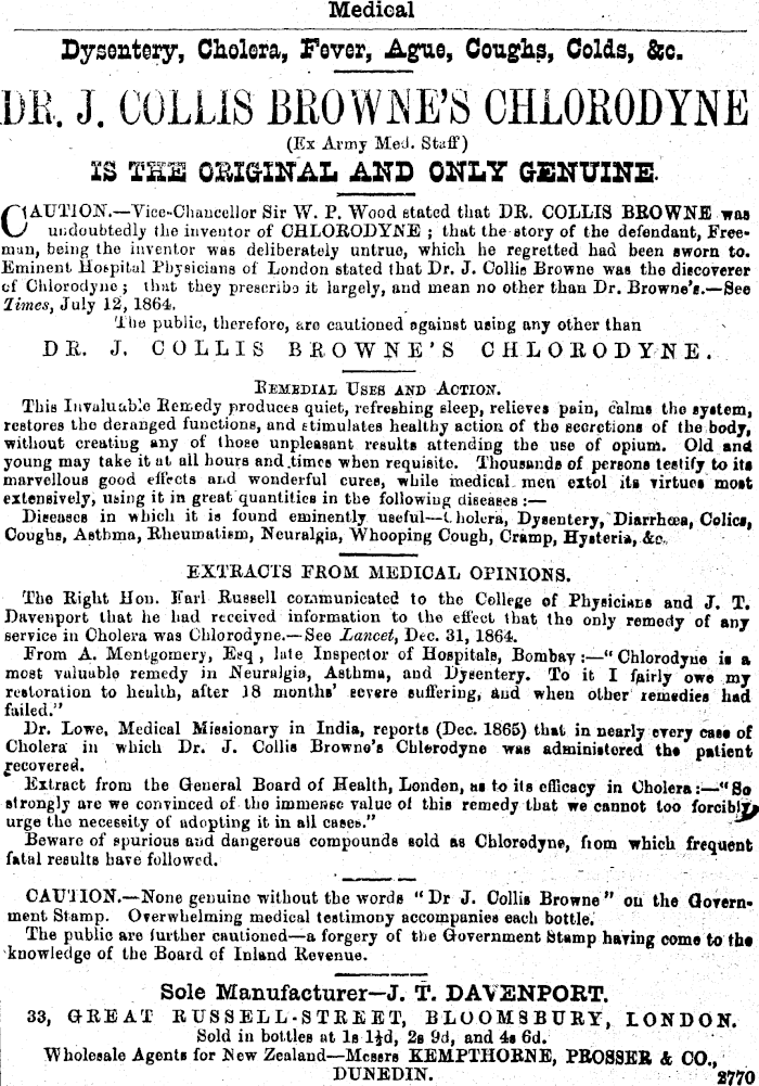 Medical Dysentery, Cholera, Fever, Ague, Coughs, Colds, Sec. DR. J. COLLiS BROWNE'S CHLORODYNE - (Ex Army Med. Staff) 2S TE2S QBSftXNAL AND ONLY GENUINE-/"IAUTION.—Vice-Chancellor Sir W. P. Wood etated that DR. COLLIS BROWNE was yj undoubtedly the inventor of CHLORODYNE ; that the story of the defendant, Freeman, being the inventor was deliberately untrue, which he regretted had been sworn to. Eminent Hospital Physicians of London stated that Dr. J. Collie Browne was the discoverer of Chlorodync ; that they prescriba it largely, and mean no other than Dr. Browne's.—See limes, July 12, 1864. 'I Ihe public, therefore, are cautioned against using any other lhan DE. J. COLLIS BBOWP'S CHLOEODYNE. Eembdiai Uses any Action. This Invuluuble Remedy produces quiet, refreshing 6leep, relieves pain, calms the system, restores the deranged functions, and stimulates healthy action of the Becretions of the body, without creating any of those unpleasant results attending the use of opium. Old and young may take it at all hours and .times when requisite Thousands of persons testify to its marvellous good effects and wonderful cures, while medical men extol its virtues most extensively, using it in great quantities in the following diseases :— Diseases in which it is found eminently useful— L holura, Dysentery, Diarrhoea, Colicf, Coughs, Asthma, Rheumatism, Neuralgia, Whooping Cough, Cramp, Hysteria, 4c, EXTRACTS FROM MEDICAL OPINIONS. The Right Hon. Ifarl Russell communicated to the College of Physicians and J. T. Davenport that he had received information to the effect that the only remedy of any service in Cholera was Chlorodyne.—See Lancet, Dec. 31, 1864. From A. Montgomery, Esq , lute Inspector of Hospitals, Bombay:—"Chlorodyue is a most valuable remedy in Neuralgia, Asthma, and Dysentery. To it I fairly owe my restoration to hcukh, after 18 months' severe suffering, and when other remedies had failed." Dr. Lowe, Medical Missionary in India, reports (Dec. 1865) thai in nearly every case of Cholera' in which Dr. J. Coll is Browne's Cblerodyne was administered th« patient recovered. Extract from the General Board of Health, London, as to its efficacy in Cholera: "So strongly are we convinced of the immense value of this remedy that we cannot 100 forcibly* urge the necessity of adopting it in all cases." -'•** Beware of spurious and dangerous compounds sold as Cblorodyne, fiom which frequent fatal results have followed. CAUTION.—None genuine without the words "Dr J. Collis Browne " ou the Government Stamp. Overwhelming medical testimony accompanies each bottle. The public are further cautioned—a forgery of the Government (Stamp having come to tbfl knowledge of the Board of Inland Revenue. Sole Manufacturer—J. T. DAVENPORT. 33, GREAT RUSSELL-STREET, BLOOMSBURY, LONDON. Sold in bottleß at Is lid, 2s 9d, and 4s 6d. Wholesale Agents for New Zealand—Messrs KEMPTHORNE, PROSBER & CO DUNEDIN. 2770