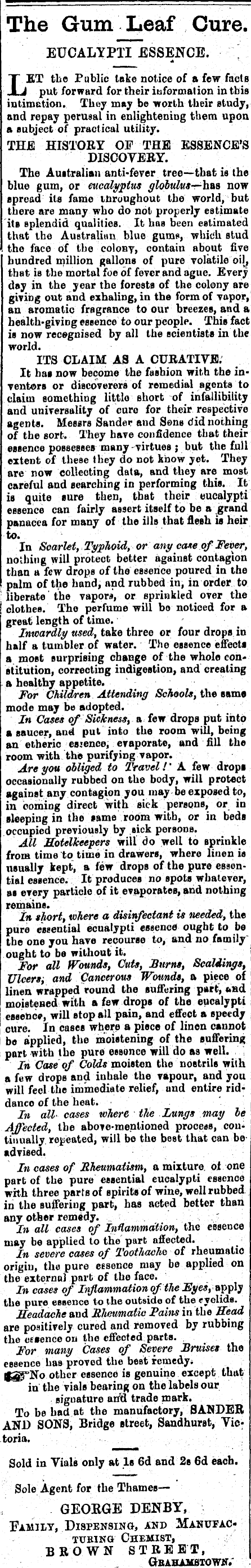 The Gum Leaf Cure. EUCALYPTI ESSENCE. ] * LET the Public take notice of ft few facts put forward for their information in tbis intimation. They may be worth their study, and repay perusal in enlightening them upon a subject of practical utility. THE HISTORY OF THE ESSENCE'S DISCOVERY. The Australian anti-fever tree—that is the blue gum, or eucalyptus globulus— has now spread its fame throughout the world, but there are many who do not properly estimate its splendid qualities. It has been estimated that the Auetraliun blue gum*, which stud the face of the colony, contain about five hundred million gallons of pure volatile oi[, that is the mortal foe of fever and ague. Every day in the year the forests of the colony are giving out and exhaling, in the form of vapor, an aromatic fragrance to our breezes, and a health-giving essence to our people. This fact is now recegnised by all the scientists in the world. ITS CLAIM AS A CURATIVE. It hat now become the fashion with the inventors or discoverers of remedial agents to claim something littlo short of infallibility and universality of cure for their respective agents. Messrs Sander and Sens did nothing of the sort. They have confidence that their essence possesses many -virtues ; but the full extent of these they do not know yet. They are now collecting data, and they are most careful and searching in performing this. It is quite sure then, that their eucalypti essence can fairly assert itself to be a grand panacea for many of the ills that flesh is heir to. In Scarlet, Typhoid, or any cote of Fever, nothing will protect better against contagion than a few drops of the essence poured in the palm of the hand, and rubbed in, in order to { 'liberate' the vapors, or sprinkled over the '{ clothes. Tho perfume will bo noticed for a great length of time. Inwardly used, take three or four drops in half a tumbler of water. The essence effects a most surprising change of the whole constitution, correcting indigestion, and creating a healthy appetite. For Children Attending Schools, the same mode may be adopted. In Cases of Sickness, a few drops put into g saucer, and put into the room will, being an etheric esience, evaporate, and fill the room with the purifying vapor. Are you obliged to Travel!' A few drops occasionally rubbed on the body, will protect against any contagion you may be exposed to, in coming direct with sick persons, or in sleeping in the fame room with, or in beds occupied previously by sick persons. All Botelkeepers will do well to sprinkle from time to time in drawers, where linen is usually kept, a few drops of the pure essential essence. It produces no spots whatever, as every particle of it evaporates, and nothing remains. In short, where a disinfectant is needed, the pure essential ecualypti essence ought to be the one you have recourse to, and no family" ought to be without it. For all Wounds, Cuts, Burns, Scoldings, Ulcers, and Cancerous Wounds, a piece of linen wrapped round the suffering part, and moistened with a few drops of the eucalypti essence, will stop all pain, and effect a speedy cure. In cases where a piece of linen cannot be applied, the moistening of the suffering part with the pure eesonce will do aa well. In Case of Colds moisten the nostrils with a few drops and inhale the vapour, and you will feel the immediate relief, and entire riddance of the heat. ■ In all- cases where tlte Lungs may be Affected, the above-mentioned process, coutinually repeated, will be the best that can be advised. In cases of Rheumatism, a mixture, ot one part of the pure essential eucalypti essence with three parts of spirits of wine, well rubbed in the suffering part, has acted better than any other remedy. In all cases of Inflammation, the essence may be applied to the part affected. In severe cases of Toothache of rheumatic origin, the pure essence may be applied on the externnJ part of the face. In cases of Inflammation of tlie Eyes, apply the pure essence to the outside of the c yolida. Headache and Rlwwmatic Pains in the Head are positively cured and removed by rubbing the essence on the effected parts. For many Cases of Severe Bruises the essence has proved the beat remedy. £§P°No other essence is genuine except that in the vials bearing on the labels our signature ami trade mark. To be had at the manufactory, SADDER AND SONS, Bridge street, Sandhurst, Victoria. Sold in Vials only at Is 6d and 2s 6d each. Sole Agent for the Thames— GEOEGE DENBY, Family, Dispensing, and Manufac* tubing Chemist, BROWN STREET, GteAHAMSTOWN.