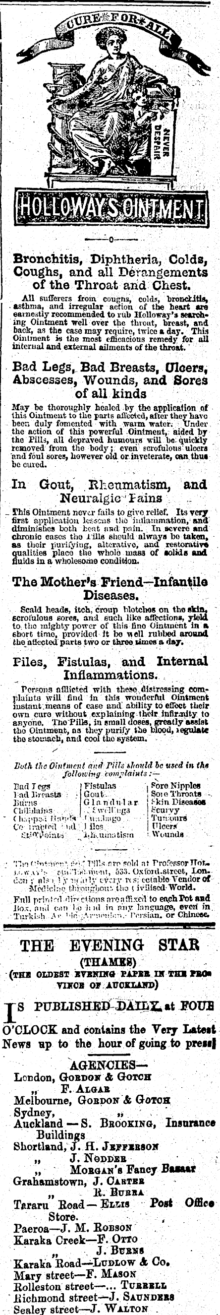 Bronchitis, Diphtheria, Colds, Coughs, and all Derangements of the Throat and Chest. All sufferers from coughs, colds, hroncLitis, ■ asthma, and irregular action of the heart «ro earnestly recommended to rub Holloway's search" ing Ointment veil over the thvout, breast, and back, as the case may require, twice a day. This Ointment is the most efficacious remedy for all intcrual and external ailments of the throat. Bad Legs, Bad Breasts, Ulcers, Abscesses, Wounds, and Sored of all kinds May be thoroughly healed by the application of this Ointment to the parts affected, after they have been duly fomented ■with mum water. Under the action of this powerful .Ointment, aided by the Pills, all depraved humours -will be. quickly removed from the body; even scrofulous'ulcers and foul sores, however old or inveterate, can thus be cured. In Gout, Khenmatism, and Neuralgic Pains _ This Ointment never fails to give relief. Its very first application lessens tho mil-animation, and' diminishes both boat iind pain. In severe and chronic easos tho i ills should always bo taken, as tlioir purifying, alterative*, and restorative qualities placo tho whole mass of solids and fluids in a wholesome condition. The Mother's Friend—lnfantile Diseases. Scald heads, itch, croup blotches on tho sUn, scrofulous sores, and each like affections, yield to the mighty power of this fino Ointment ia a short time, provided it bo well rubbed around tho aficcted parts two or three times a day. Files, Fistulas, and Internal Inflammations. Persons afflicted with these.distressing complaintu will find in this wonderful Ointment instant.means of cage and' ability to effect their own euro without explaining their intimity to anyone. Tho Pills, in small doses, greatly assist tho Ointment, oa they purify the blood, legulate tho stomach, and cool tho system. Both the Ointment ami Pills ilinuld be used in tht following complaints: — Earl Tegs Fistulas . Foro Nipples l;ull>r?asts • Gout- ! SoioThroats - liursis Glnndnlar f-kin Digoase* C hil'.jlaiua -' f wiling.* J-'cuivy ' ( hjj'pa.; M:i«s'ti f ii.-..1)-.i(:o Tun ours I Co ivac'i-fil 'iid I ilos | (floers j tliWfokui J.ilßUin:itisrn ' Wounds i • :■" " Till-! rvo «old :it rro. r?RSorTToU , i..w \i'-- cf.i.'i *'■ rin-lit, 333. Oxioul.slreot, lon. ccji ; ill? i' ,v Tt.i' 1 *>■ L\ r:xy ns; cctablo Vendor Of | M«!:ci::o tl:rn!i~uou'. (ho (iviliscd-World. I Full prinf-d 'lirrnions nronlnxeil to enphPot and Jto.v. nii.l en) I'D )i nl in ji'ny language, evert in ! Turfci-Vi .V '-'n ..'.i-'.im':.:--..- IVisiiin. or Chinese. THE EVENING STAB (THAMES) (thb oldest XTiKora papbb. ih ma n» TIKOB OF AUCKLAND) TS PUBLISHBD-i)AILZ.at FOUB O'CLOCK and contains the Very Latest News Hp to the hour of going to pre»i| AGENCIES— London, Gobdojt & Gotch „ F. Anjab Melbourne, Gobdon & Gotoh Sydney, >, Auckland —S. Bbooking, Insurance Buildings Shortland, J. H. Jbffbbbon „ J. Noddeb ; „ Moboan'b Fancy Baiaar Grahamstown, J. Oabtkb „ B. Bubba T*raru Boad — Elms Post Offic« Store. Paeroa—J. M. Eobson Karaka Creek—P. Otto M . J. Bcbms Karaka Eoad—Lttdiow A Co. Mary street—F. Mason Eolleston street—... Tcbbbli * liichmond street—J. Saundbbs Sealey street—J. Walton .
