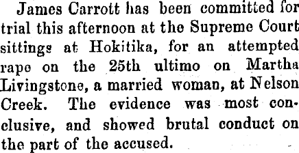 James Carrott has been committed for trial this afternoon at the Supreme Court sittings at Hokitika, for an attempted rapo on the 25th ultimo on Martha Livingstone, a married woman, at Nelson Creek. The evidence was most conclusive, and showed brutal conduct on the part of the accused.