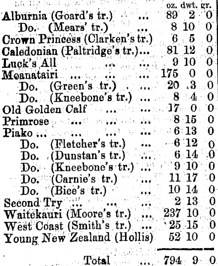 oz. dwt. ctr. Alburnia (Goard's tr.) ... 89 2 0 Do. (Mean' tr.) ... 8 10 0 Crown Princess (Clarken's tr.) 6 5 0 Caledonian (Paltridge'str.)... 8112 0 Luck's ,M 9 10 0 Moanatairi 175 0 0 Do. (Green's tr.) .... 20 .3 0 Do. (Xneebone's tr.) ... 84 0' Old Golden Calf 37 0 0 Primrose ... ... •■. 8 15 0 Piako 6 13 0 Do. (Fletcher's tr.) ... 612 o Do. (Dunstan's tr.) ... 614 0 Do. (Kneebone'str.) ... 9 10 0 Do. (Carnie's tr.) ... 11 17 0 Do. (Bice's tr.) ... 10 14 0 Second Try :.' 2 13 0 Waitekauri (Moore's tr.) ... 237 10 0 West Coast (Smith's tr.) ... '25 15 0 Young New Zealand (Hollis) 52 10 0 Total ... 794 9 0