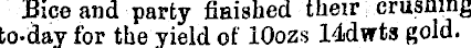 Bice and party finished their crushing to-day for the yield of lOozs 14dwta gold.