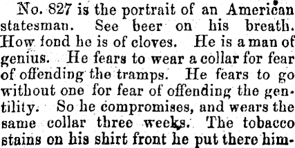 No. 827 is the portrait of an American statesman. See beer on his breath. How fond he is of cloves. He is a man of genius. He fears to wear a collar for fear of offending the tramps. He fears to go without one for fear of offending the gentility; So he compromises, and wears the same collar three weekjs. The tobacco stains on his shirt front lie put there him-