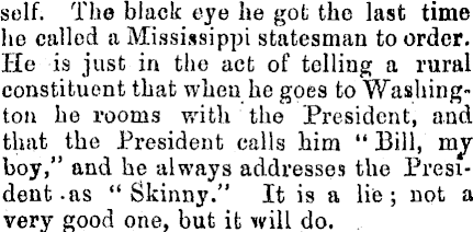 self. The black eye he got the last time he called a Mississippi statesman to order. He is just in the act of telling a rural constituent that when he goes to Washington he rooms with the President, and that the President calls him " Bill, my boy," and he always addresses the Presi-dent-as "Skinny." It is a lie; not a very good one, but it will do.