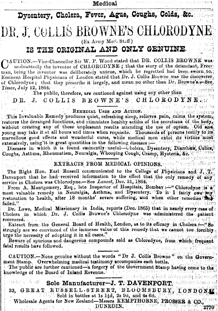 Medical ■ Dysentery, Cholera, Fever, Ague, Coughs, Colds, &o. DR. J. COLLIS BROWNE'S CHLORODYiNE (Ex Army Mori. Stuff) IS THE ORIGINAL AITS ONLY GENUINE. , : CAUTION.— Vice-Chnncellor Sir W. P. Wood stated that DE. COLLIS BEOWNE was,' undoubtedly the inventor of CHLOEODYJBE }' that the etory of the defendant, Freeman, being the inventor wus deliberately untrue, which, he regretted had been, sworn, to. ( Eminent Uotpitul Phjsicians of London stated that Dr. J. Collie Biowne .was the discoverer, ol Chlorodyno ; thut, they pr'ebcribo it largely, and mean no other than Dr. Brpwne's.T-See.. limes, July 12, 1864. - \ ..,■:>., Tbe public, therefore, are cautioned against using any other than , DX. J. COLLIS BKOWNE'S CHLOBODYNE.;,. Bimbdial/ Uses and Actiok. . >,:■?* .This Invaluablo Bemedy produces quiet, refreßbing sleep, relieves pain, calms, the system^ restores the deranged functions, and stimulates healthy acli&n of the secretions of the body,; -without creating any of those unpleasant results attending the use of opium. Old an^ I young may take it ut all hours and times when requisite. Thousands of persons testify to its, marvellous good effects and wonderful cures, while medical men extol its virtues most extensively, uth)g*it in great quantities in the following diseases :— " : "* ' Diseases iv which it is found eminently - useful— L holera, Dysentery; Diarrheeai .Celica;' Coughs, Asthma, Eheumalism, Neuralgia, Whooping Cough, Cramp, Hysteria, &c. •. ' ' ' '" EXTEAOTS FROM MEDICAL OPINIONS. ' • ' ' ' ' The Bight Hon. Earl Russell communicated to the College of Physicians and J. ,T.. Davenport that he had- received i information to the effect that the only remedy of uuy' service in Cholera was Cblorodyne.—See Lancet, Dec. 31,1864. : • '''■ From A. Msntgomery, Esq., late Inspector of Hospitals, Bombay :—" Chlorodyne is" a r most valuable remedy in Neuralgia, Asthma, and Dysentery. To it I fairly owe"jay* restoration to 'health, after 18 months' sev«re suffering, and when other remedies "mi^ failed." ' ' :«••• Dr. Lowe, Medical Missionary in India, reports (Dec. 1865) that in nearly every casa of Cholera in which Dr. J. Collis Browne's Chbrodyne was administered th« patient recovered. ■ ' •'>''. , Extract from the General Board of Health, London, a* to its efficacy in Cholera .-v-" So strongly are we convinced of the immense value ot this remedy that we cannot too forcibly i urge the necessity of adopting it in all caßes." , . ( ; Beware of spurious and dangerous compounds sold as Chlorodyne, from which > frequeut fatal results have followed. • '' CAUTION.—None genuine without the words " Dr J. Collis Browne " on tbe Govern- , ment Stamp. Overwhelming medical testimony accompanies eaoh bottle. ' < ' ' i The public are further cautioned —a forgery of the Government Btamp having come to the ] knowledge of tbe Board of Inland Eevenue. . < '' ______.—— i v i i ■ >■' Sole Manufacturer-J. T. DAVENPORT. , ■ ; 33, GEEAT EUSSELL-STEEET, BIOQMSBUEy,- lONDON.B' : . ':. i' >J I Soldi in bottles at Is lid, 2s 9d, and 4s 6d-. . " '' ' ! ■■ 1 ■ Wholesale Agents for New Zealand—Messrs KEMPTHOENE, PEOSBEE & CO.', ' ' / DUNEDIN. ' ' ' ■ ' ' 2770'