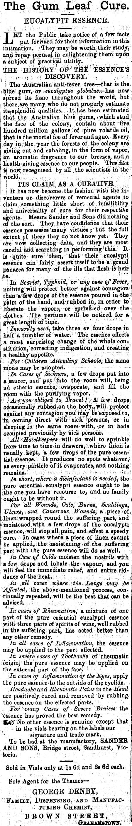 The Gum Leaf Cure. EUCALYPTI ESSENCE. T ET tho Public take notice of a few facts I J put forward for thoir information in this intimation. .They may be -worth their study, and repay perusal in enlightening them upon a subject .of practical utility. THE HISTORY ' OF; THE ESSENCE'S --> - DISOOVEBY. . ' The Australian anti-fever tree—that is the > blue gum', or eucalyptus globulus —has now spread its fame throughout the world, but there.are many who do not properly estimate its, splendid qualities. It übb been estimated that, the Australian blue gums, • which stud the face of the colony, oontaiu about fire, hundred million gallons of pure volatile oil, that is the mortal foe of fever and ague. Every day in.the year the forests of the colony are giving out and exhaling, in the form of vapor, an aromatic fragrance to our breezes, aud a health-giving essence to'our people. This fact is now. recognised by all the scientists in the world.' ITS CLAIM. AS A CURATIVE. It has now become the fashion with the inventors or discoverers of remedial agents to claim something little short of infallibility and universality of cure for their respective agents. Messrs Sander and Sens did nothing of the sort. They have confidence that their essence possesses 'many virtues ; but the full extent of these they do not know yet. They are now collecting data, and they are most careful and searching in performing j this. It is quite sure then, that their' eucalypti essence can fairly .assert itself to be a grand panacea for many of the ills that flesh is heir to. ' In Scarlet, Typhoid, or any ca*e qf Fever, nothing will protect better against contagion' than'a few drops of the essence poured in the palm of the hand, and rubbed in, in order to liberate the vapors, or sprinkled over the clothes. - The perfume will be noticed for a great length I'of time. ' Inwardly used, take three or four drops in half a tumbler of water.' The essence effects ; a most surprising change of the whole constitution, correcting indigestion, and creating a healthy appetite. For' Children Attending Schools, the same mode may be adopted. In Cases of Sickness, a few drops put into a saucer, and* put into the room will, being an etheric essence, evaporate, and fill the room with the purifying vapor. 1 'Areyou obliged,to Travel! ,■ A few: drops occasionally rubbed.on the body,,will protect against any contagion you may be exposed to, in coming direct with sick 'persons, or in sleeping in the same room- with, or in beds occupied previously- by sick persons. All Kotelkeepers will do well to sprinkle from time to time in drawers,' where lirien is usually kept, a few drops of the pure essential essence. It produces no spots whatever, as every particle of it evaporates, and nothing remains. In short, where a disinfectant is needed, the pure essential.ecualypti essence ought to be the one you have recourse to, and no family ought to be without it. For all Wounds, Cuts, Burns, Scoldings, Ulcers, and Cancerous Wounds, a piece of, .linen wrapped round the Buffering- part, and moistened .with a few drops of the eucalypti essence, will stop all pain, and effect a speedy cure, In cases where a piece of linen cannot be applied, the moistening of the suffering part .with the pure essence will do as well. In Case of Colds moisten the nostrils with a few drops and inhale the vapour, and you will feel the immediate relief, and entire riddance of the heat. In all cases where the Lungs may be Affected, the above-mentioned process, continually repeated, will be the best that can be advised. In cases of Rheumatism, a mixture of one part of the pure essential eucalypti essence with three parts of spirits of wine, well rubbed in the suffering part, has acted better than any other remedy. In all cases qf Inflammation, the essence may be applied to the part affected. In severe cases of ToothacW of rheumatic origin, the pure essence may be applied on the external part of the face. In cases of Inflammation bf the Eyes, apply tho pure essence to the outside of the eyelids. . Headache and Rheumatic Pains in the Read are positively cured and removed by rubbing the eesence on tho effected parts. , For many Cases of Severe Bruises the has proved the best remedy. (SfNo other essence is genuine except thut in the vials bearing on the labels our signature and trade mark. To be had at the manufactory, SANDER AND SONS, Bridge street, Sandhurst, Victoria. Sold in Vials only at Is 6d and 2s 6d each. Sole Agent for the Thames— GEOKGE DENBY, Family, Dispensing, and Masufao tubing Chemist, BROWN STREET, GtßAßjJuzomr.