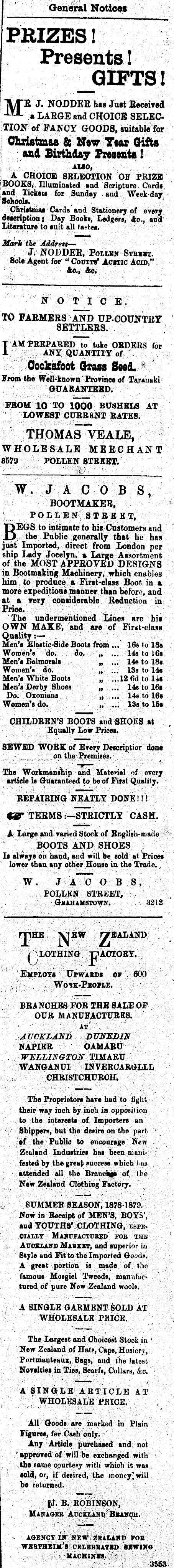 General Notices PRIZES! Presents! _GIFTS! ~M~B J. NODDER Las Just Received ■***- a LARGE and CHOICE SELECTION of FANCY GOODB, suitable for Christmas & New Tear Gifts and Birthday Presents ! AIIO, i A CHOICE SELECTION OF PRIZE BOOKS, Illuminated and Scripture Cards, and Tickets for Sunday and Weekday [Schools. | Christmas Cards and Stationery of every description; Day Books, Ledgers, *c, and Literature to suit all ta»tes. Marie the Addrett — . J. NODDER, Poiikn Stbbbt. . Bole Agent for " Coottts* Acbtic Acid," 4c., &o. NOTICE. TO FARMERS AND UP-COUNTRY SETTLERS. T AM PREPARED to take ORDERS for 1 ANY QUANTITY of Cocksfoot Grass Seed. ' From the Well-known Province of Taranaki GUARANTEED. FROM 10 TO 1000 BUSHELS AT LOWEST CURRENT RATES. THOMAS TEALE, WHOLESALE MERCHANT 3579 POLLEN STREET. 1 ,w W.JACOBS, BOOTMAKER, POLLENSTREET, BEGS to intimate to his Customers and , the Public generally that be has just Imported, direct from London per ship Lady Jocelyn, a Large Assortment of the MOST APPROVED DESIGNS in Bootmaking Machinery, which enables him to produce a First-class Boot in a more expeditions manner than before, and at a Tery considerable Reduction in Price. ' , „ The undermentioned Lines are his OWN MAKE, and are of First-class Quality:— Men's Elaatic-Side Boots from ... 16s to 18s . Women's do. do. „ ... 14s to 16b Men's Balmorals „ ... 14s to 18s Women* do. „ ... 13b to 14s Men's White Boots „ ...12 6d to Us 1 Men's Derby Shoes „ ... 14s to 16s Do; Oxonians „ ... 14s to 16s , Women's do. „ .... 13s to 15s CHILDREN'S BOOTS and SHOES at Equally Low Prices. ' SEWED WORE of Erery Descriptor done on the Premises. The Workmanship and Material of every article is Guaranteed to be of First Quality. REPAIRING NEATLY DONE!!! sJST TERMS :-STKICTLY CASH. A Large and raried Stock of English-made BOOTS AND SHOES Is always on hand, and will be sold at Prices lower than any other House in the Trade. \ W. JACOBS, POLLEN STREET, Gjiahamstown. 3212 I " "'• | mHE VTEW jfEALAND | "/ -LOTHING TjiAOTORY. I Employs Upwabds qf . 600 ! . . . Wotjk-Pbople. BRANCHES FOR THE SALE OF OUR MANUFACTURES. I at' ! AUCKLAND DUNEDIN NAPIER OAMABU . WELLINGTON TIMARU WANGANUI INVEROARGLLL 1 , CHRISTCHUROH. The Proprietors have had to fight . their way inch by inch in opposition ; to the interests of Importers an Shippers, but the desire on the part. * j ef the Public to encourage New i Zealand Industries has been niuni- | fested by the great success which )>«s I . attended all the Branokfs of, the | New Zealand Clothing Factory. L SUMMER SEASON, 1878-1879. I Now in Receipt of MEN'S, BOYS', I and YOUTHS' CLOTHING, espe- | OIALIY MaNITEACTVBBD FOB THIS | AUOKUUW Mabkbt, and superior in Style and Fit to the Imported Goodn. A great portion is made of the famous Mosgiel Tweeds, manufactured of pure New Zealand wools. A SINGLE GARMENT SOLD AT WHOLESALE PJRICE. The Largest and Choicest Stock in ' New Zealand of Hats, Caps, Hosiery, Portmanteaux, Bags, and the latest Novelties in Ties, Scarfs, Collars, &c. A SINGLE ARTICLE AT WHOLESALE PRICE. All Goods are marked in Plain Figures, for .Cash only. Any Article purchased and not "approved of will be exchanged with the tame courtesy with which it was sold, or, if detired, the money* will be returned. ' |J. B. ROBINSON, Manager Auckland Bbahch. - agency ik new. zkalakd fob WBBTHKIIt's CBLBBBATBD BBWINO KACHINBB. - - ' ' 3553