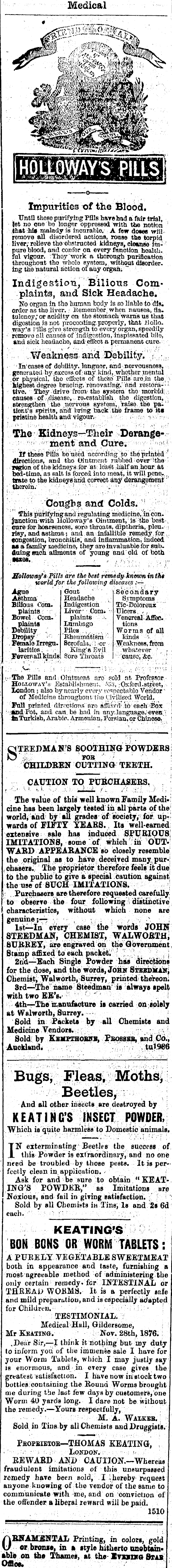 Medical Impurities of the Blood. . Until these parifylng Pills hare had a fair trial, let no one bo longer oppressed with the notion : that hi« malady is incurable. A few doses will, remove all disordered actions, rouse the torpid liver; relieve tho obstructed kidneys, cleanse impure blood, and confer on every function hoalth. ful vigour. Thoy work a thorough purification throughout tho whole system, without disorder, ing the natural action of auy organ. ~ Indigestion, Bilious Complaints, and Sick Headache. No organ in tho human body is bo liable to dls, order as tho liver. .Kemember when naiiEeft, fla. tulenoy; or acidity on the stomach warnß us that digestion is not proceeding.property, that t\ olio, way's Tills glvn strength to evory organ, speedily removo rll causes of indigestion, inspissated bile, and sick headache, and eflcct a permanent euro. Weakness and Debility. ; In cases of dobility. languor, ana nervousnoss, generated by excess of any kind, whether mental or physical, tho effects of these Pills are in the highest degree bracing, renovating, nnd vestora- ■ tivo. They drive from the system tho morbid causes of .disease, reestablish tho digestion, strengthen the nervous systom, raise the patient's ppirits, and bring back the frame to its pristine health and vigour. The Kidneys—Tlieir Derangement and Cure. If these Pills bo used according to the printed * directions, and tho Ointment nibbed over 'tho region of the kidneys ibr at least half an boar At bed-time, as salt is forced into meat, it will pone, tarate to the kidneys arid correct any derangement therein. Coughs and Colds. This purifying and regulating medicino/incon. junction with llolloway's Ointment, is the best cure for hoarseness, soro throats, diptheria, pleu. risy, and asthma; and an infallible remedy for congestion, bronchitis, and inflammation, indeed aa a family medicine, they are invaluable for snb. doing such ailments of young and old of both •exes. Solloway's Pills are the best remedy known in tht world for the following diseases : — Ague Gout " Secondary Asthma Headache . Symptoms Bilious Com. Indigestion ' Tic-IDoloreux plaints Liver 1 Com. Ulcers - Bowel Com. plaints - Venereal Affec. plaints Lumbago tions Debility Piles Worms of all Dropsy Rheumatism kinds Pemalo Irregn. ScrofuLi, or Weakness, from larities. King's fivil wba*pver Feverpall kinds Sore Throats I caueo, &c. The Pilla and Ointment- nro fqM at Professor HollowAY't> Establi-hmen;. •"';>.>, Oxford.street, London; also by nearly every rosnrctiiblo Vendor ~ of Medicine througbom, i ho i ivilieed World, Poll priDtpd (Ur-'CtioTi.s nro afTisrf rt to eneh -Box ' and Pot, and can be had in any language, even taTurkish, Arabic. Armenian, I*orfiian, or Chinese. STEEDMAN'S SOOTHING POWDERS JOB ' ' CHILDREN CUTTING TEETH. CAUTION TQ PURCHASERS. The value of this well known Family Medicine has been largely tested in all parts of the world, and by all grades'of society,' for upwards of FIFTY YEARS. Its well-earned extensive sale has induced SPURIOUS, IMITATIONS, some of which in OUTWARD APPEARANCE so closely resemble the original as to have deceived many, pur- , chasers. The proprietor therefore feels it due to the publio to give a special caution against the use of SUCH IMITATIONS. I Purchasers are therefore requested carefully to observe the four following distinctive characteristics, without which none are | genuine;— , , " Ist—ln every case the words JOHN' STEEDMAN, CHEMIST, WALWORTH, SURREY, are engraved on the Government Stamp affixed to each packet. ' , , 2nd —Each Single Powder has directions for the dose, and the words, John Steedman, , Chemist, Walworth, Surrey, printed thereon., 3rd —The name Steedman' is always spelt, with two EE'b. ' ' ! 4th—The manufacture is carried on solely at Walworth, Surrey. - Sold in Packets by all Chemists and, Medicine Vendors. Sold by Kempthobhb, Pbossbb, and Co., Auckland. tu1986 Bugs, Fleas, Moths, Beetles, : And all other insects are destroyed by , X EAT ING'S INSECT POWDER, Which is quite harmless to Domestic animals. IN exterminating Beetles tbe success of this Powder is extraordinary, and no one need be troubled by those pests. It is per-' fectly cleun in application. .■ Ask for and be sure to obtain " KEATING'S POWDER," as Imitations are Noxious, and fail in giving satisfaction. Sold by all Chemists in Tins, Is and 2s 6d each. KEATING'S BON BGNS OR WORM TABLETS: A PURELY VEGETABLE SWEETMEAT both in appearance and taste, furnishing a most agreeable method of administering the only certain remedy, fcr INTESTINAL or THREAD WORMS. It is a perfectly ante and mild preparation, and is especially adapted for Children. TESTIMONIAL. Medical Hall, Gildersome, Mr Keating. Nov. 28th, 1876. .Dear Sir, —I think it nothing but my duty to inform you of the immense sale I have for your Worm Tablets, which I may justly say is enormous, and in every case gives the greatest satisfaction. I have now in stock two bottles containing the Round Worms brought me during tbe Jaut few days by customers, one Worm 40 yards long. I dare not be without the remedy.—Yours respectfully, M. A. Walkeb. Sold in Tins by all Chemists and Druggists. Peopeieiob—THOMAS KEATING, London; REWARD ANi> CAUlJON.—Whereas fraudulent imitations of this unsurpassed remedy have been sold, I .hereby request anyone knowing of the vendor of the same to communicate with me, and on conviction of the offender a liberal reward will be paid. 1510 OBNAMENTAL Printing, in colors, gold or bronie, in a style hitherto unobtainable on the Thames, at the lynnrct Stab Office.