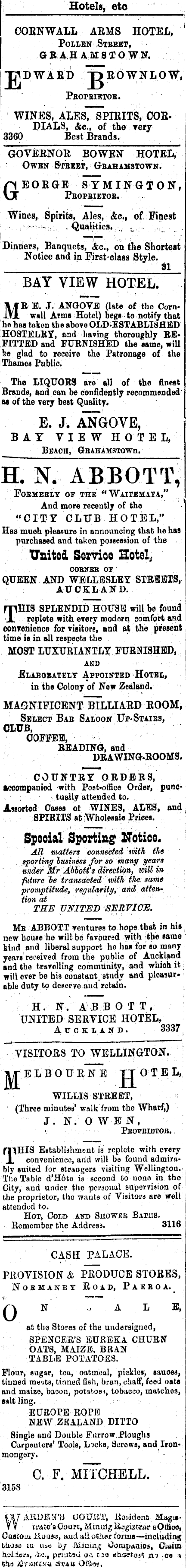 Hotels, etc CORNWALL ARMS HOTEL, J Pollen Stbeet, GRAHAMSTOWN. EDWARD TOR OWN LOW, ±5 Pbopbietob. WINES, ALEsTsPIRITS, COBDIALS, &c, of the rery 3360 Best Brands. GOVERNOR BO WEN HOTEL, Owen Stbbbt, Gbahamstowk. nEOEGE SYMINGTON, XX Pbopbietob. Wines, Spirits, Ales, &c, of Finest • ,-. ,^-:^ ; ,- t . Qualities. V . -i; .. ..,;_■_,. Dinners, Banquets, &c, on the Shortest Notice and in First-class Style. 81 BAY VIEW HOTEL. MR E. J. ANOOVE (late of the Cornwall Arms Hotel) begs to notify that ' he has taken the above OLD-ESTABLISHED HOSTELRY, and having thoroughly REPITTED and FURNISHED the same, will be glad to receive the Patronage of the i Thames Public. The LIQUORS are all of the finest Brands, and can be confidently recommended as of the very best Quality. E. J. ANGOVE, BAY VIEW HOTEL, : _ ■ ■■ ■ Beach, GBAHAMSTOwn. H. N.. ABBOTT^ FOBMEBLT OF THE "WiITEMATA," And more recently of the "CITY C.LUB HOTEL," ; Has much pleasure in announcing that he has purchased and taken possession of the United Service Hot@l s COBNEB OF QUEEN AND WELLESLEY STRBEXS, AUCKLAND, THIS SPLENDID HOUSE will be found replete with every modern comfort and convenience for visitors, and at the present time is in all respects the MOST LUXURIANTLY FURNISHED, '■■■■■ . AND Elabobatelt Appointed Hotel, in the Colony of New Zealand. MAGNIFICENT BILLIARD ROOM, Select Bab Saloon Up- Staibs, CLUB, COFFEE, READING, and drawing-rooms. country"orders, accompanied with Post-office Order, puno- . ; ; tually attended to. Assorted Cases ot WINE?, ALES, and SPIRITS at Wholesale Prices. Special Sporting ITotico. \ All matters connected with the sporting business for so many years under Mr Abbott's direction, will in future be transacted with the: same promptitude, regularity, and atteti' tion at THE UNITED SERVICE. Mb ABBOTT ventures to hope that in his, now houße he will be favoured with ;the same kind and liberal support he has for so many years received from the public of Auckland and the travelling community, and whioh it; will ever be his constant, study and pleasurable duty to deserve and retain. H. 1. ABBOTT, UNITED SERTICE HOTEL, Auckland. 3337 VISITORS TO WELLINGTON. Tl| ELB 0 U R*N~E TJ OTEL, WILLIS STREET, (Three minutes' walk from the Wharf,) J. N. 0 WEN, PaovßißToa. THIS Establishment is replete with every convenience, arid will bo found admirably suited for strangers visiting Wellington.; [T!:e Table d'H&to ia second to none in the City, and under the personal supervision of the proprietor, tho wants of Visitors are well attended to. Hot, Coid akd Showbb Batds. Remember the Addres3. 3116 CASH PALACE. PROVISION & PRODUCE STORES, Noemanbt Road, Paeboa. ■ f■■ ■ —— r\ TH .. A L B, at the Stores of the undersigned, SPENCER'S EUREKA CHURN OATB, MAIZE, BftAN TABLE POTATOES. Flour, sugar, tea, oatmeal, pickloi, sauces, tinned mo-its, tinned fish, bran, chaff, feed oats and maizo, bacon, potatoas tobacco, matches, salt ling. EUROPE ROPE NEW ZEALAND DITTO Single and Double Furrow Ploughs Carpenters' Tools, Locks, Screws, and Ironmongery. - . C. F. MITGHELL. 3158 WAKDEtf'tf OOm-tT, iiasidouc Magtstnste's Court, Miniiig liogiatrur BOiaoo, Custooi ILoatv, tmd nil othi»f forms—including choji) iq ur>o by Miuiuj; OoiapAQios, Claim holier*, Ac, priutsii aa sao nhattos*-, n» .oo a