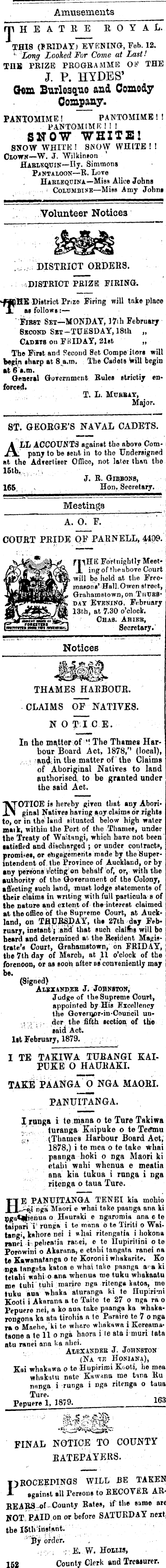 Amusements m H E AT R E ROYAL. THIS (JRIDAY; EVENING, Feb. 12. * Long Looked For Come at Last! THB PRIZE PROGRAMME Off THE J. P. HYDES' Cfem Burlesque and Comedy Company. PANTOMIME ! PANTOMIME ! ! PANTOMIME ! ! ! SNOW WHITE! SNOW WHITE ! SNOW WHITE ! ! Ciown —W. J. Wilkinson flAßlßQtnN—lly. Simmons Pantaloon—R. Love Hablequina—Miss Alice Johns ...■•■.-.. - CoitJMßisE —Miss Amy Johns Volunteer Notices ;!;.. DISTRICT ORDERS. PRIZE FIRING. <f%HE District Prize Firing will take place i as follows:— "Fi'bst' Set—MONDAY, I7ih February Sicond Sbt-TUESDAY, 18th „ Cadstb on FKIDAY, 21st „ The First and Second Bet Compe itora will begin sharp at 8 a.m. The Cadets will begin *t 6Lm. General Government Rules strictiy enforced. T. L. MvaMkX, Major. ST. GEORGE'S NAVAL CADETS. 1 XL ACCOUNTS against tho above Com/X pany to be sent in to tho Undersigned at the Advertiser Office, not later than the 16th. J. R. Gibbons, 165 V - ... Hon. Secretary. Mestinga A. 0. F. COURT PRIDE QF BAR NELL, 4409. VJ^JJW^ riTHii Fortnightly Meet/^o^lP^(7^ ■*- ing of the above Court tj&mJsk&f^ will be held at the Free* I. HBSiMMg^ $ masons* Hall.Owen street, •Amrara|ffiff|yL, Grahamatewn, on TiiTTßß,JkJ'*""'B^»C day Evbnino, February BFU&IJi&bJm 13th, at 7.30 o'clock, Chas. Ah ibb, Notices THAMES HARBOUR. CLAIMS OF NATIVES. N O TICE. In the matter of M The Thames Harbour Board Act, 1878," (local), ■ and,in. the matter of* the Claims of Aboriginal Natives to land authorised to be granted under the said Act. NOTICE is hereby given that any Aboriginal Natives having a,ay claims or rights to, or in the land situated below high water maik, within the Port of the Thames, under the Treaty of WaitHngi, which have not been ■atisfied and discharged ; or under contract?, promises, or engagements mode by the Superintendent of, the Province of Auckland, or by •ny persons' Acting' on behalf of, or, with the authority of the Government of the Colony, affecting such land, must lodge statements of their claims in writing with full particular of the nature and extent of- the interest claimed at the office of the Supreme Court, at Auckland, on THURSDAY, th« 27th day Feb. ruary, instant; and that suoh olairns will be beard and determined at. the Resident Magistrate's Court, Grahamstown, on FRIDAY, the 7th day of March, at 11 o'clock of the forenoon, or as soon after as* conveniently may be. (Signed) Aiexandeb J. Johnston, Judge of the Supreme Court, appointed by His Excellency the Goverqpr-in-Csuncil un- ■;■;■-,■■ der the fifth section of the said Act. lit February, 1879. . I TE TAKIWA TURANGI EAIPUKE O HAURAKI. TAKE PAANGA O NGA MAORI. PANUITANGA. I runga i te mana o te Ture Takiwa 'J...1. turauga Kaipuke o teTetfmu %-t iTbames Harbour Board Act, 1878,) i te mea o te take whai paanga hoki o nga Maori ki etabi wahi whenua c meatia ana kia tukua i runga i nga j ritenga o taua Ture. TTE VAXVP-.-^QA- TENEI k>a m°hio Jtl.-H|i nga Maori c whai take paanga ana ki gguf^tenua o; Hauraki c ngaromia ana c te taipart "i 5 runpa i te mana 6 te Tiriti o Waitangi, kahore nei i wliai rilengatia i hokona ranri i peheafia rar.ei, c te Hupiritini ote Pornwini o Akarana, c etnbi tangata ranei na te Kawanatanga ote Koroni i whakarite. Ko nga tangiitakatoa c whai talte paanga a'a ki tetabi wahi o ana whenua me tuku whakaatu me tuhi' tuhi marire nga ritenga iatoa, me tuku aua whaka aturanga kite nupiri-ni Kooti i Akarana a te Taite te 27 o nga ra o Pepuere nei, a ko aua take paanga ka whakarongona ka ata tirohia a te Puraire te 7 o nga ra o Maehe, kite whure whakawa i Kereamataone a te 11 o nga haora i te ata i muri tata ntu ranei ana ka nhei. AiiEXANDBB J. Johnston (NA TIS HONIANA), Kai whakawa o te Hupirimi Eooti, he mea whakutu nnte Kawana me frina Ru nnnga i runga i nga ritenga o taua Ture. • Pepuere 1, 1879. H>3 FINAL NOTICE TO COUNTY RATEPAYERS. PROCEEDINGS WILL BE TAKEN 1 against all Persons to RECOVER ARREARS of-County Rates, it the same are KOtJpAID on or before SATURDAY next, the IStb-instiint. '^By order. ''. , ;v ; ;E. W. HOM-M, X 52 County Clerk and Treaaurer.