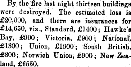 By. the fire last night thirteen buildings were destroyed. The estimated loss is £20,000, and there are insurances for £14,650, viz., Standard, £1400; Hawke's Bay, £900; Victoria, £900; National£l3oo; Union, £1900; South British, £800; Norwich Union, £900; New Zealand, £6550.