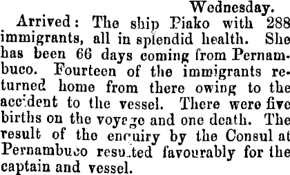 Wednesday. Arrived: The ship Piako with 288 immigrants, all in splendid health. She has been 66 days coming from Pernambuco. Fourteen of the immigrants returned home from there owing to the accident to the vessel. There were five births on the voyege and one death. The result of the enquiry by the Consul at Pernambuco resulted favourably for the captain and vessel.