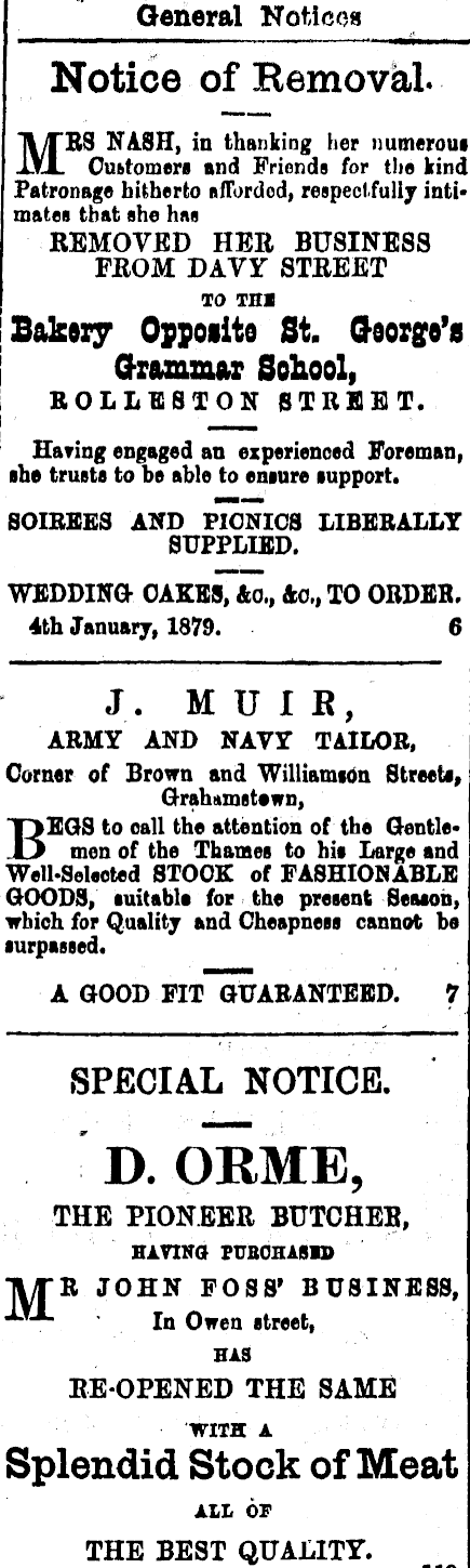 General Notices Notice of Kemovkl MBS NASH, in thanking her numerous Customers and Friends for the kind Patronage hitherto nflordod, respectfully inti* mates that she has REMOVED HER BUSINESS FROM DAVY STREET TO THI jßalwxy Opposite St. GeorgaV | Grammar Sohool, i ROLLESTON STREET. i •■ ■ ___ Hating engaged an experienced Foreman, she trusts to be able to ensure support. SOIBEES AND PICNICS LIBERALLY SUPPLIED. WEDDING- OASES, &0,, Ac, TO OBDSB. 4th January, 1879. 6 J. MU 18, ABMY AND NAVY TAILOR, Corner of Brown and Williamson Streets, Grahametewn, T>EGS to call the attention of the Gentle* JiJ men of the Thames to his Large and Well-Selected STOCK of FASHIONABLE GOODS, suitable for the present Season, which for Quality and Cheapness cannot be surpassed. A GOOD FIT GUARANTEED. 7 SPECIAL NOTICE. D.ORME, THE PIONEER BUTCHER, HATING PtJBOHASM) IITB JOHN FOSS' BUSINESS, "*■'"*■ ' In Owen street, HAS REOPENED THE SAME WITH A Splendid Stock of Meat AIL OF THE BEST QUALITY. iin