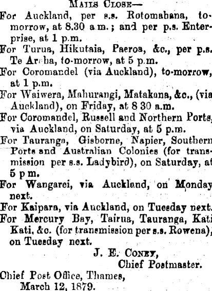 Maiis Ciosk— For Auckland, per s.s. Botomabana, tomorrow, at 8.30 am; and per p.s. Enterprise, at 1 p.m. For Turua, Hikutaia, Paeroa, &c, per p.B. Te Ax< ba, to-morrow, at 5 p.m. For Ooromandel (via Auckland), to-morrow, at 1 p.m. -.■••,- For Waiwera, Mnhurangi, Matakana, 4c, (via Auckland), on Friday, at 8 30 a.m. For Coromandel, Russell and Northern Porte, via Auckland, on Saturday, at 5 p.m. For Taurango, Gisborne, Napier, Soutbern "Ports'arid Australian Colonies (for transmission per 8.9. Ladybird), on Saturday, at 6 pm. For Wangarei, via Auckland, on Monday next. •.-■■- ■■•■. : ■■'■.:-. For Kaipara, via Auckland, on Tuesday next. For Mercury Bay, Tairua, Tauranga, Kati Kati, &o. (for transmission per s.s. Kowena), on Tuesday next. J. B. Conit, Chief Postmaster. Chief Post Office, Thames, March 12,1879. - : ,;..."..