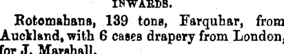 INWABDS. Rotomahana, 139 tons, Farquhar, from Auckland, with 6 cases drapery from London, for J. Marshall.